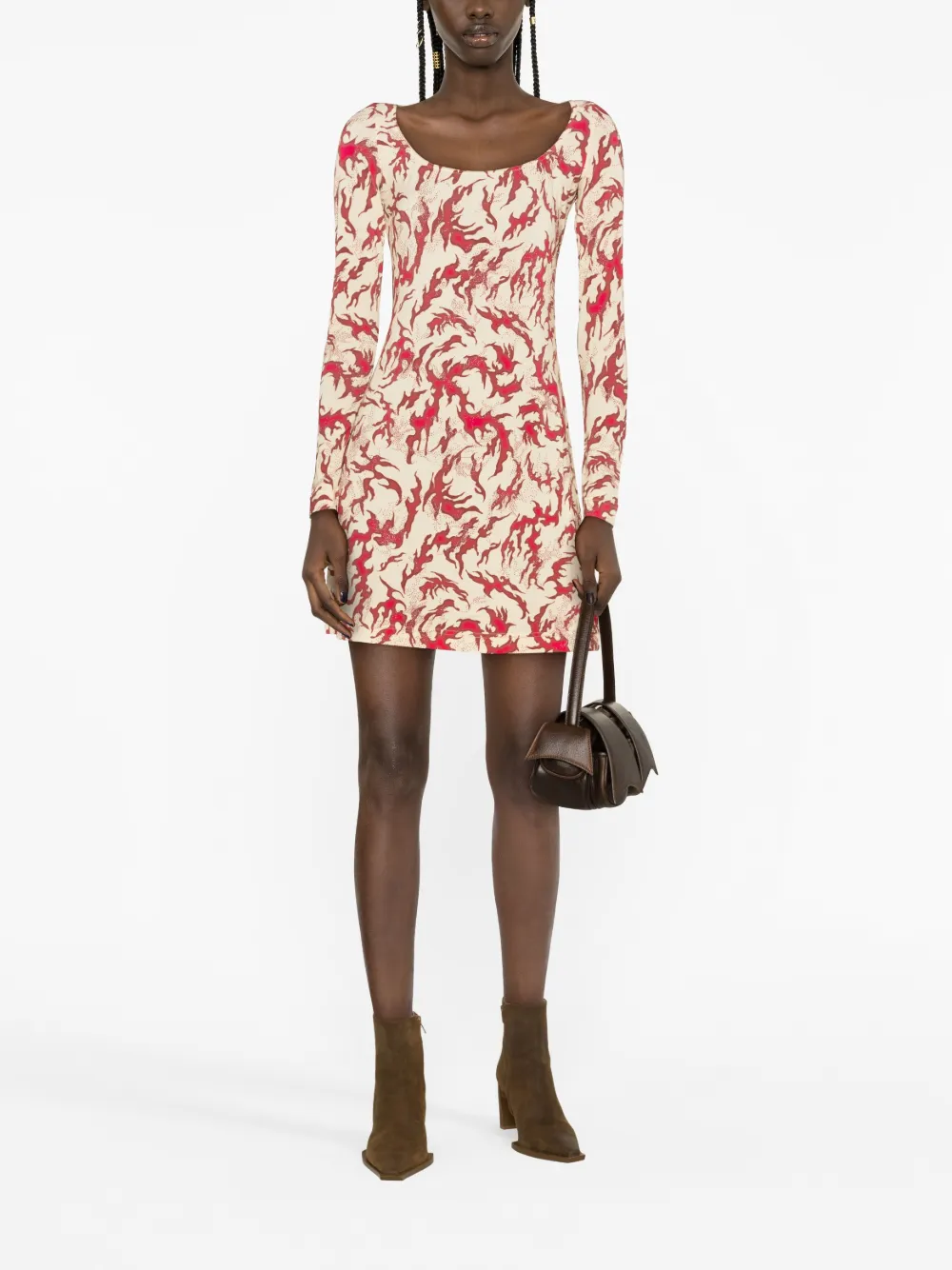 Красный, бежевый, стрейчевая ткань, сплошной графичный принт, U-образный вырез, длинные рукава, длина до бедер и прямой подол.