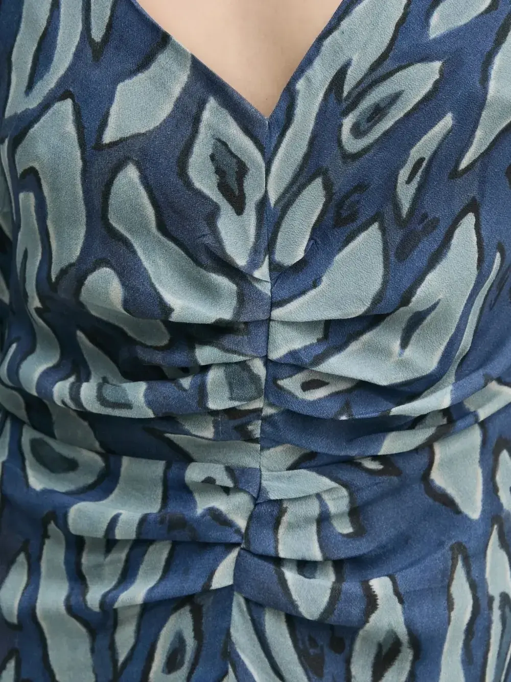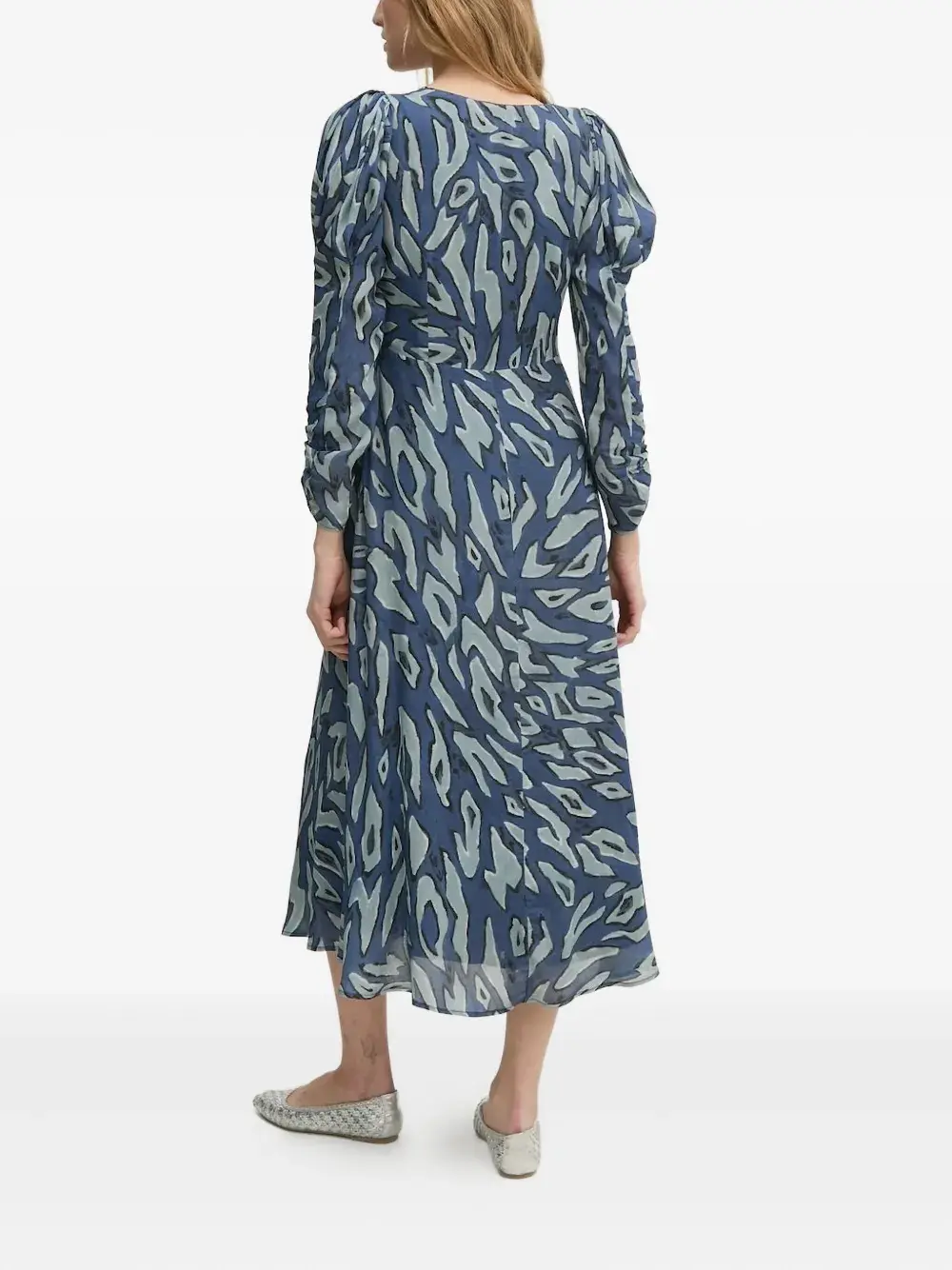 Синий абстрактный принт, V-образный вырез, рукава-буфы, присборенные детали, длинные рукава