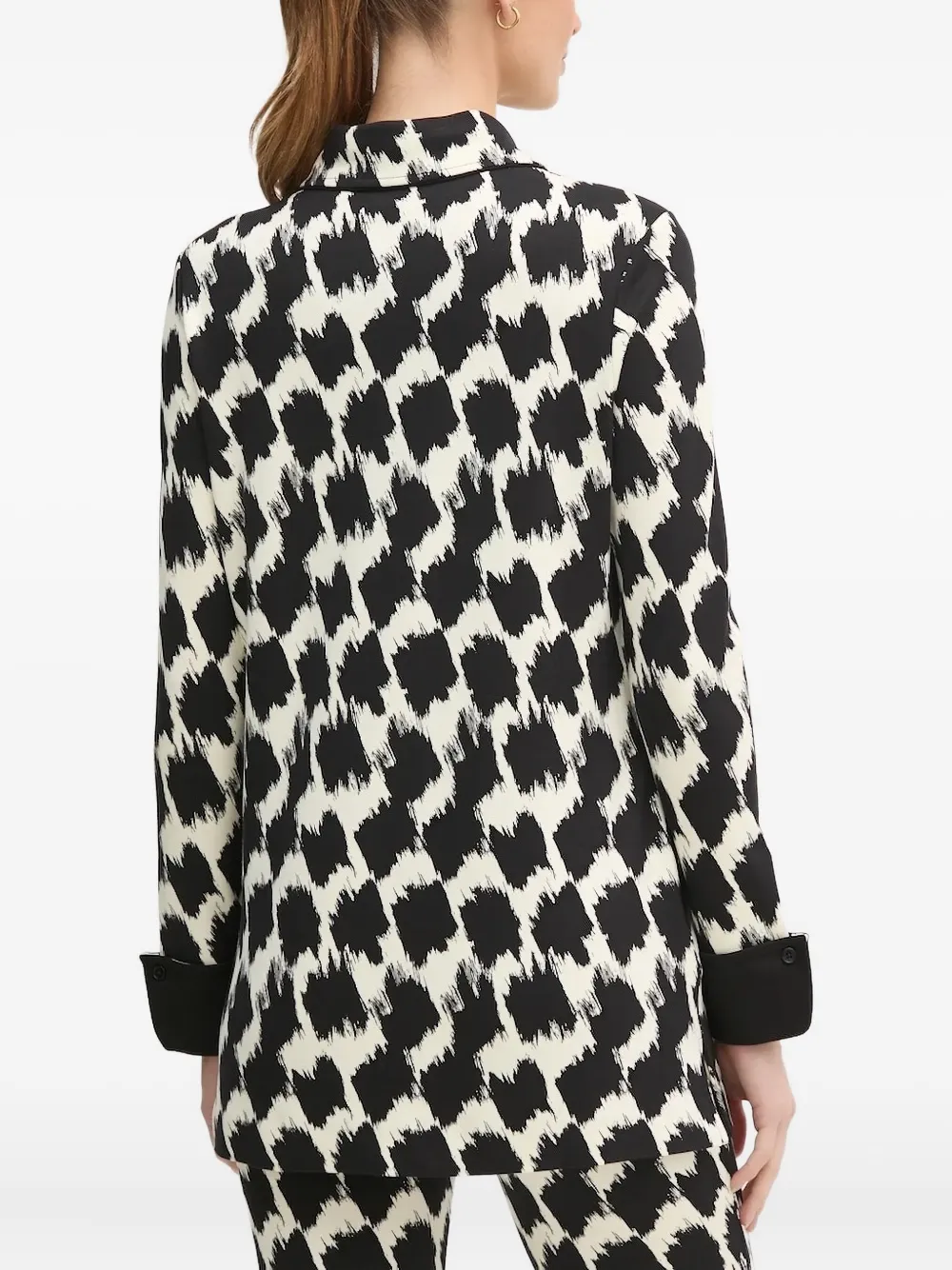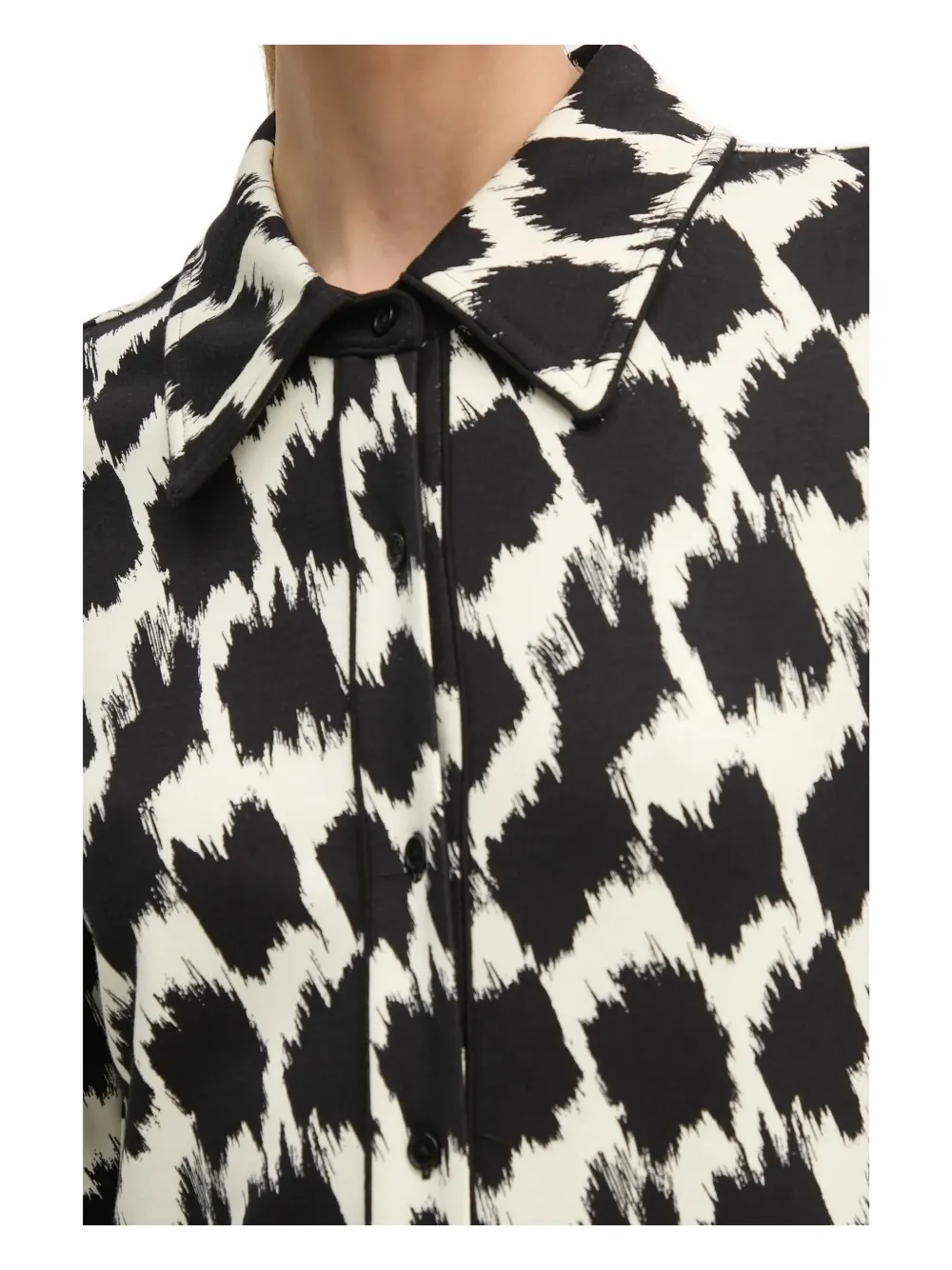 Черный и белый абстрактный принт, классический воротник, длинные рукава, застежка на пуговицы спереди, контрастные манжеты.