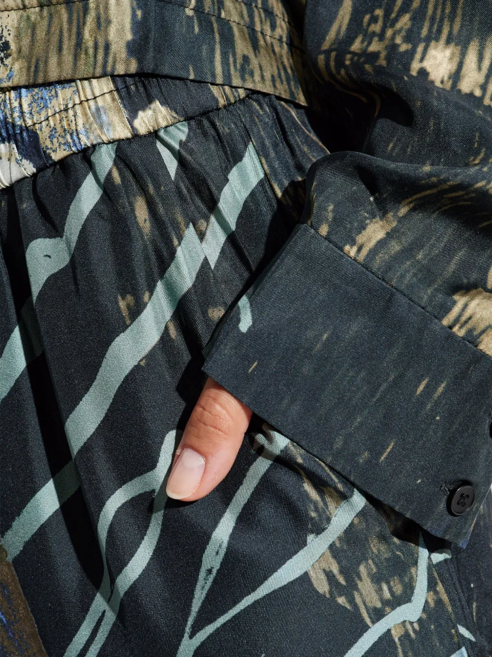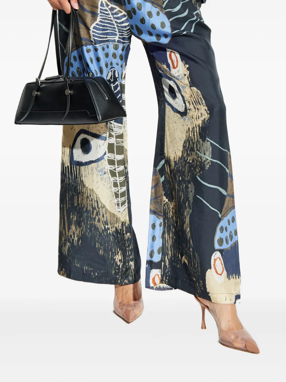 Черный абстрактный принт, эластичный пояс, широкие штанины, боковые карманы, шелковый материал