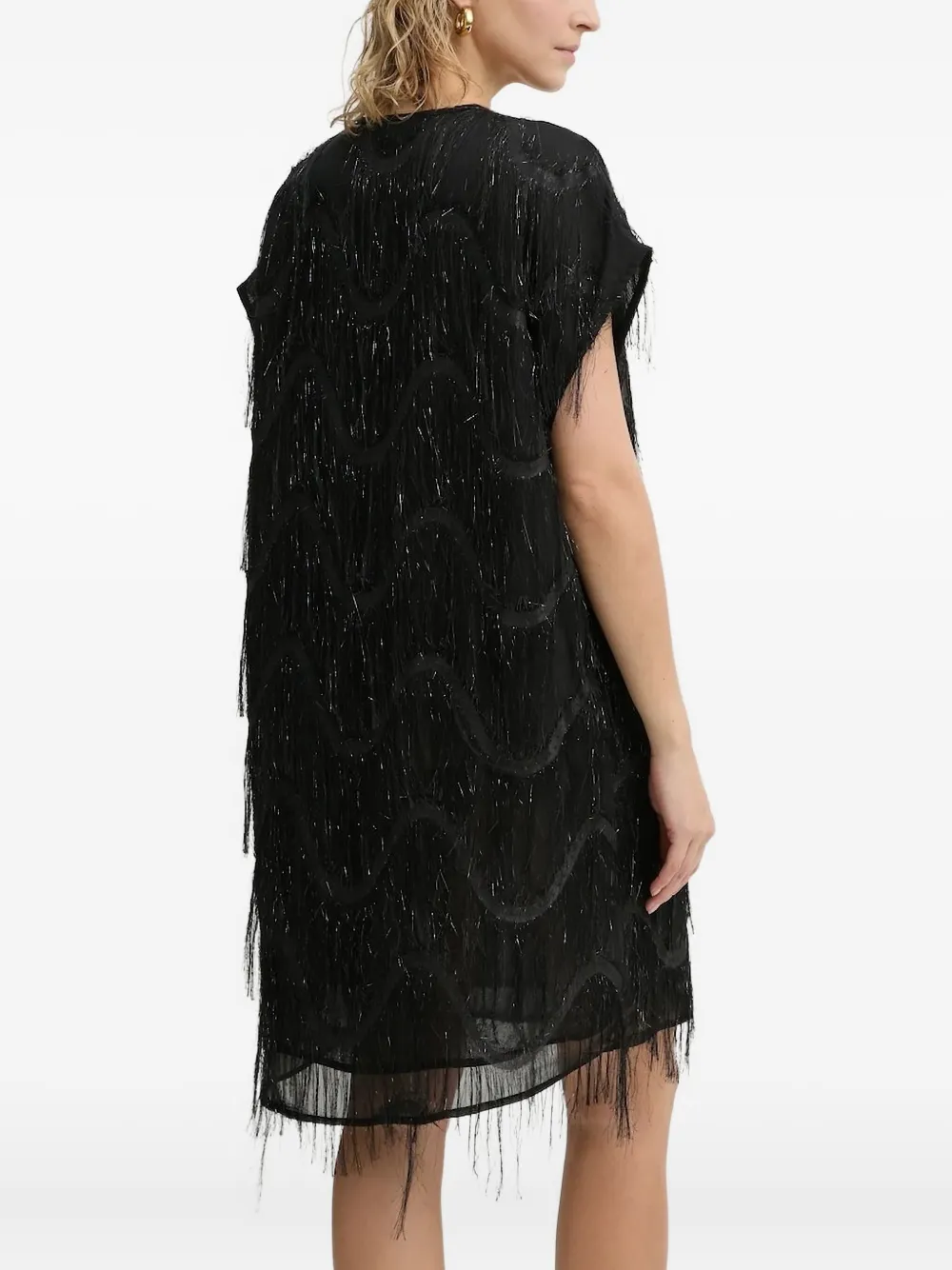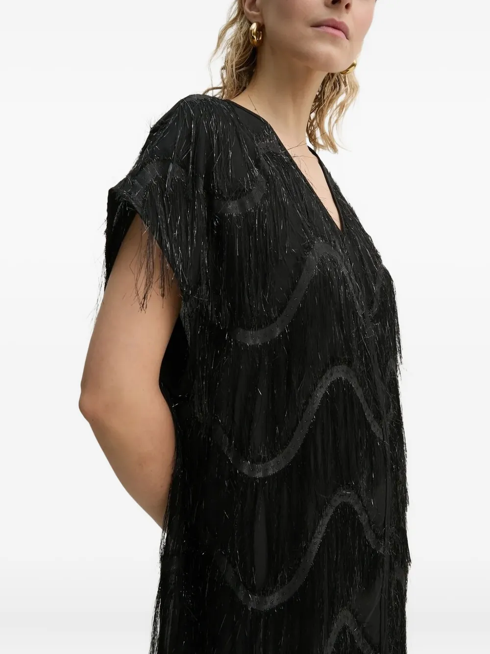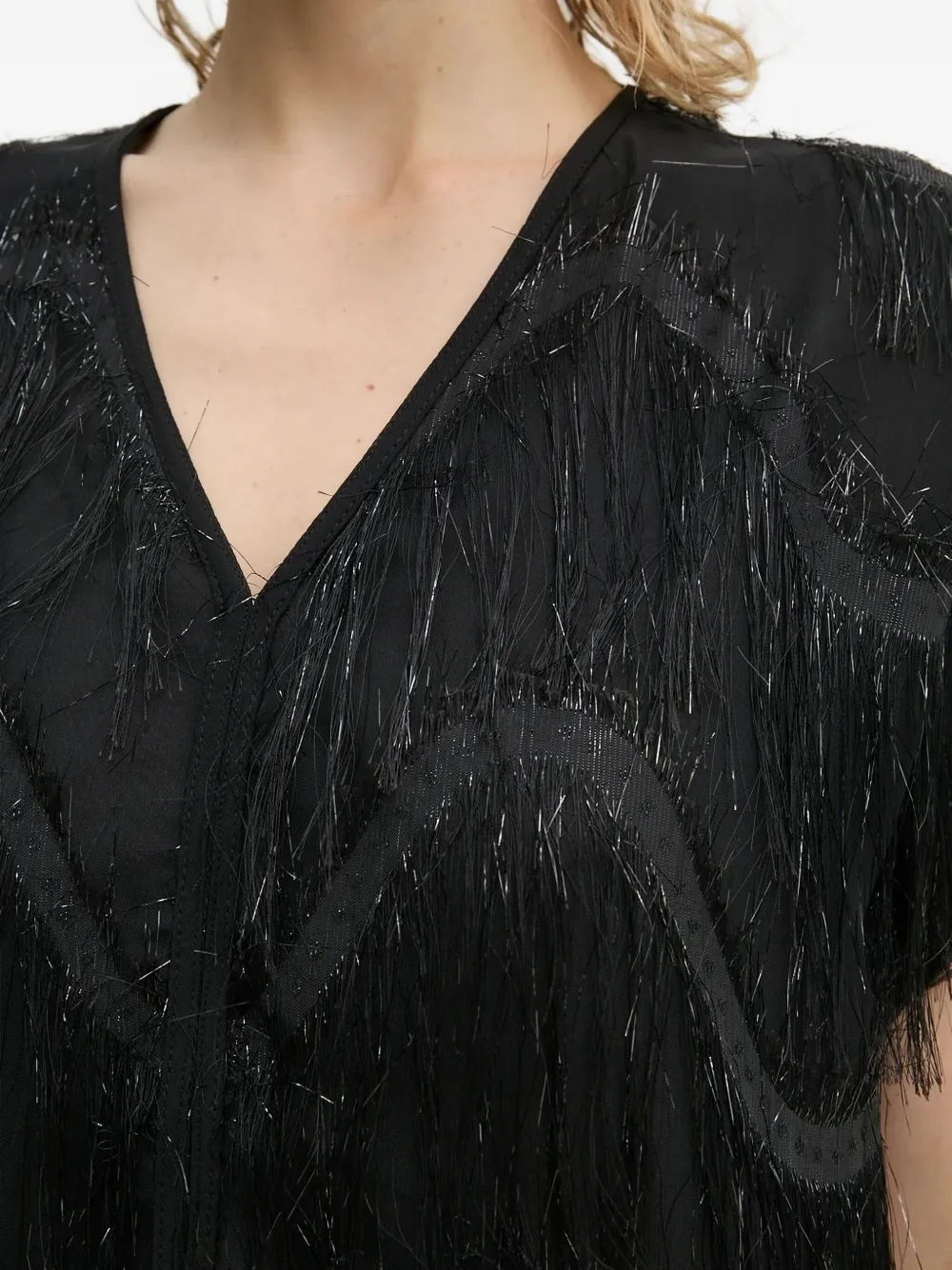 Черная многослойная бахрома, короткие рукава, V-образный вырез