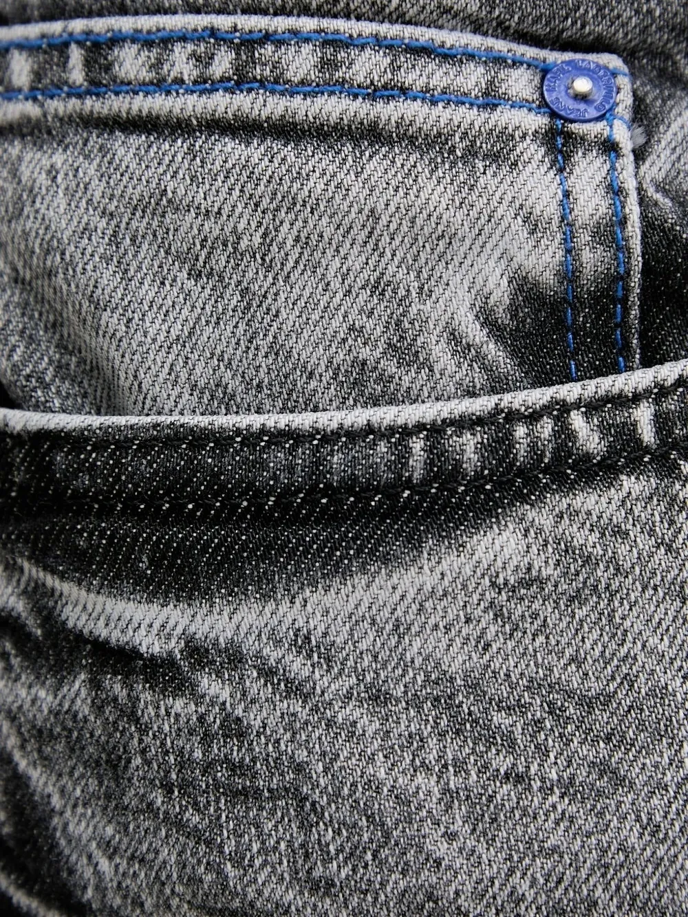 Серый, кислотно-белого цвета, с синей строчкой, на заднем кармане, фирменная нашивка