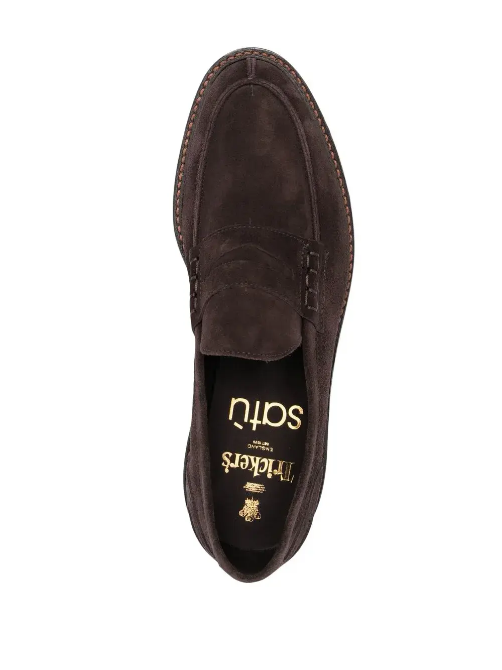 Кофейный, замша из телячьей кожи, строчка в тон, прорези на язычке, модель без застежки, миндалевидный носок, стелька с логотипом и кожаная подошва.