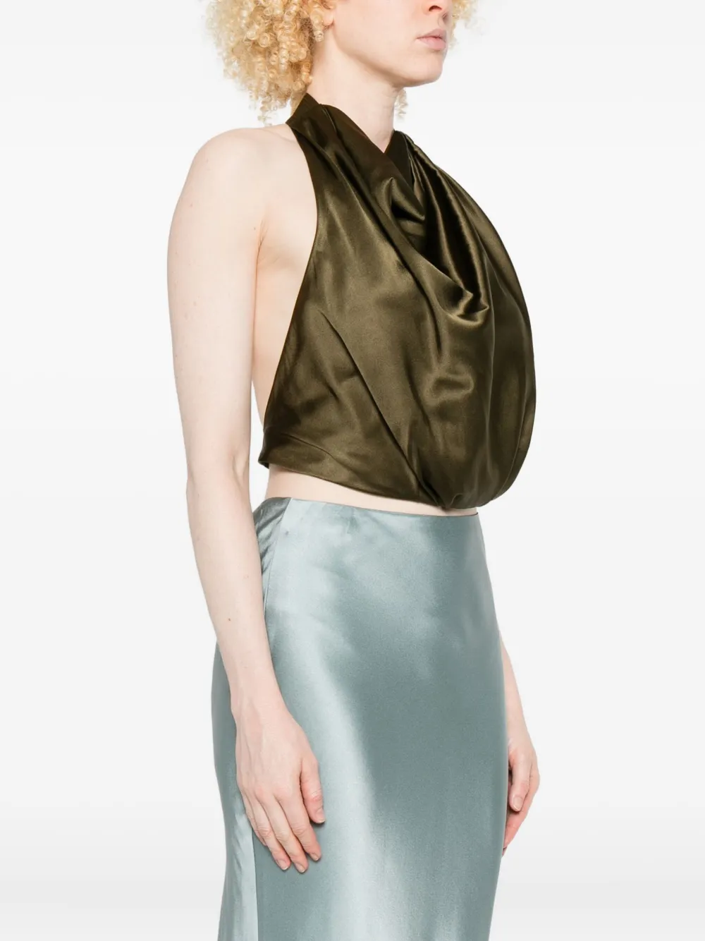 Оливково-зеленый, с драпировкой, воротник-хомут, без рукавов, из смесового шелка