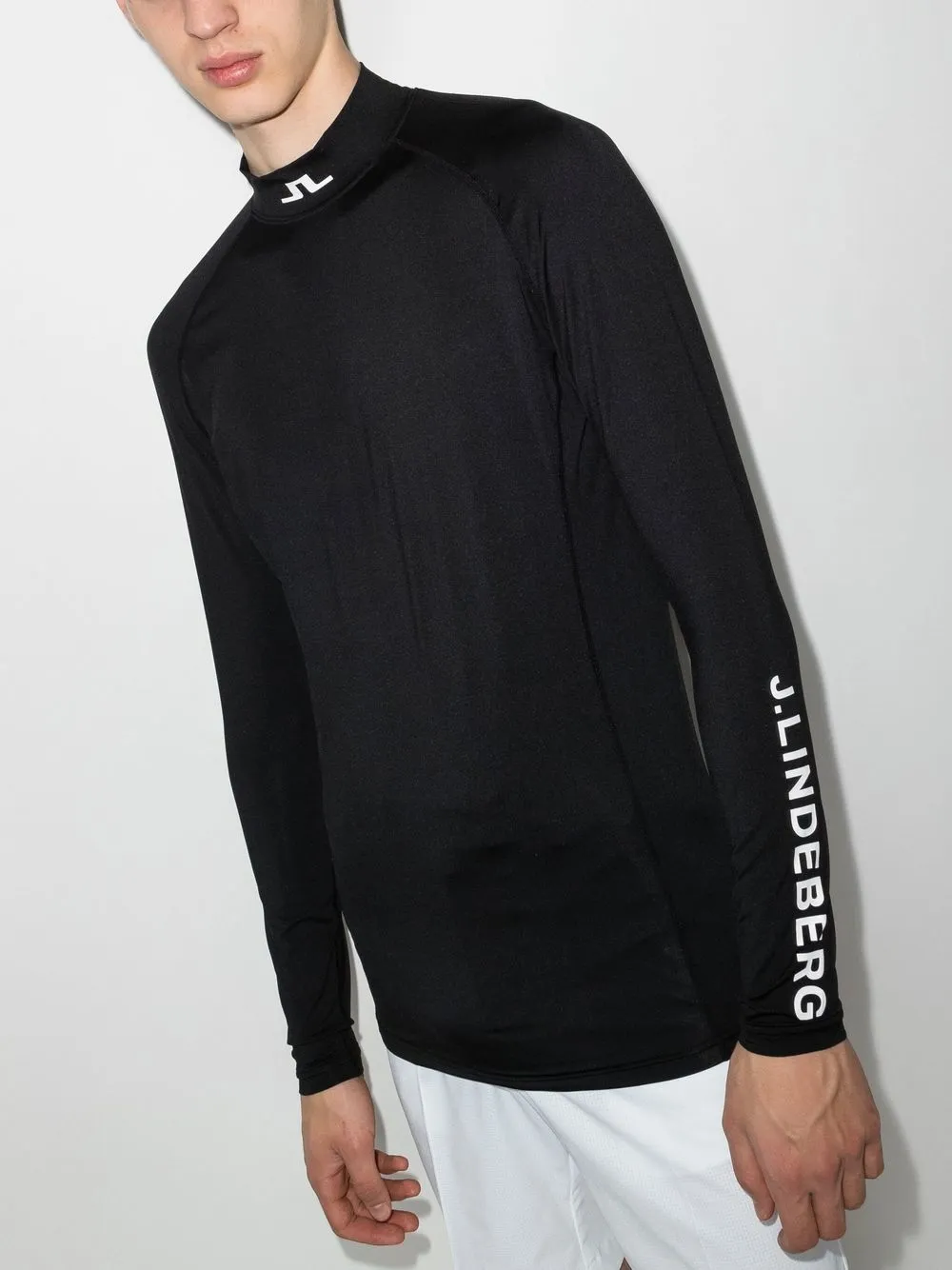 Эластичная модель, компрессионный материал, высокий воротник, воротник с вышитым логотипом, длинные рукава реглан, принт с логотипом на рукаве и прямой подол.