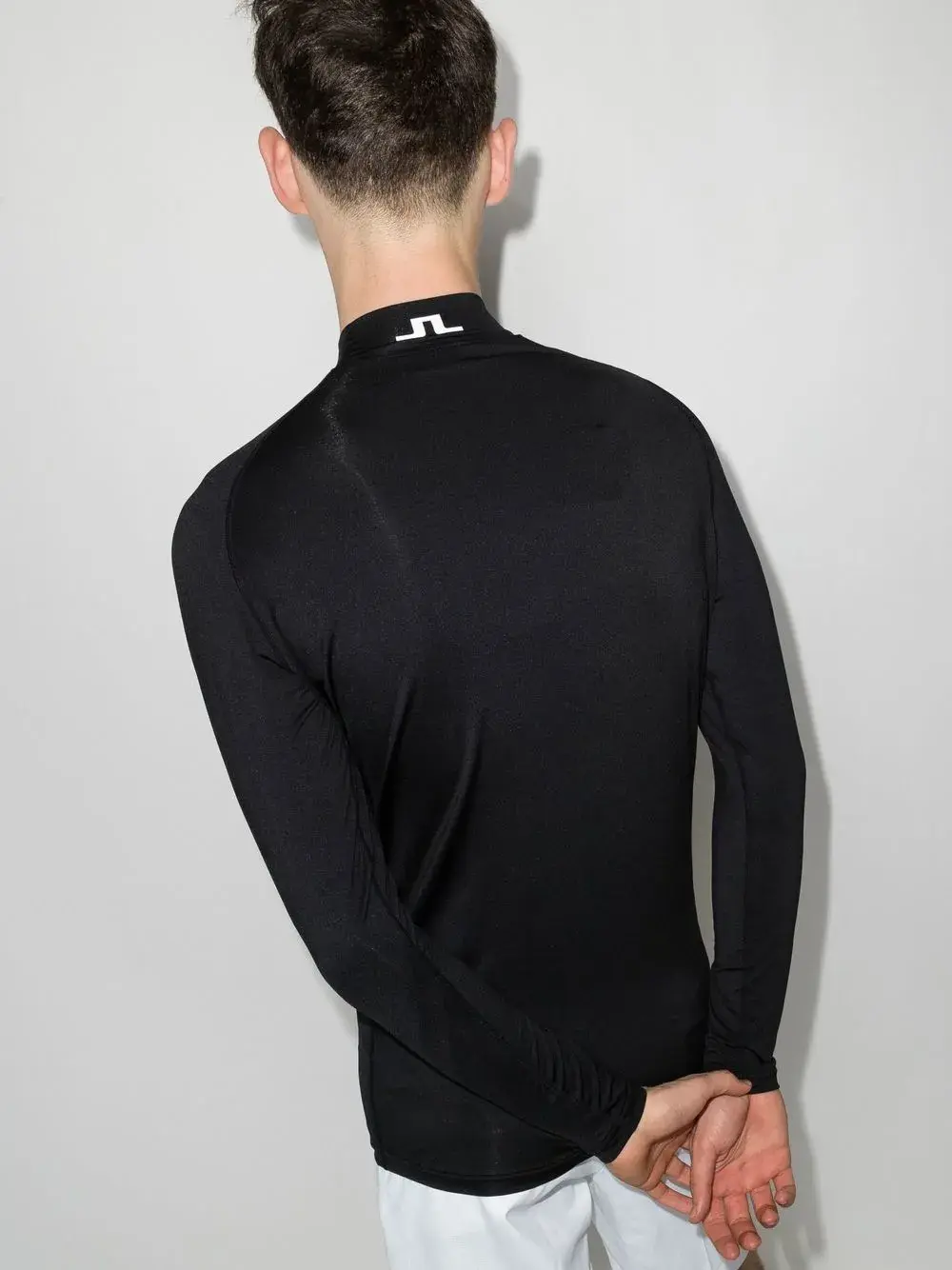 Эластичная модель, компрессионный материал, высокий воротник, воротник с вышитым логотипом, длинные рукава реглан, принт с логотипом на рукаве и прямой подол.