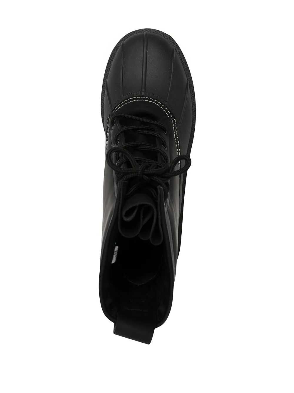 Контрастная строчка, петля для подтягивания сзади, закругленный носок, длина по щиколотку, шнуровка спереди, плоская подошва и водонепроницаемый материал. Цвет: черный.