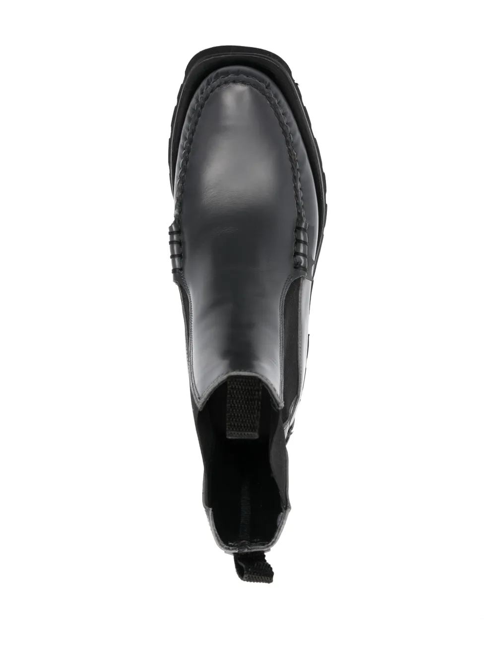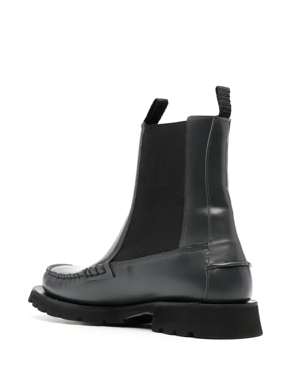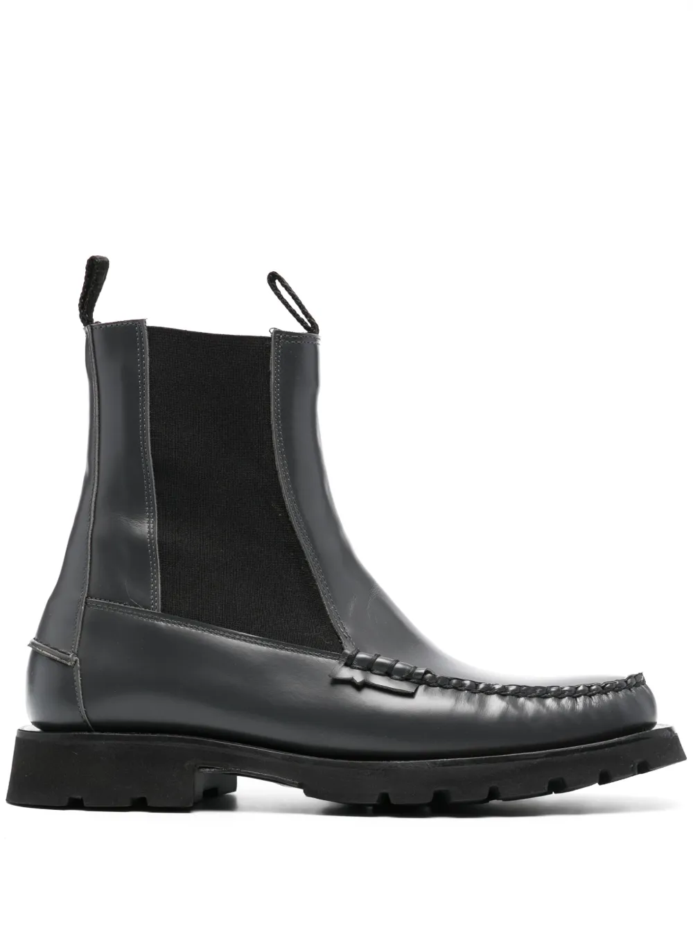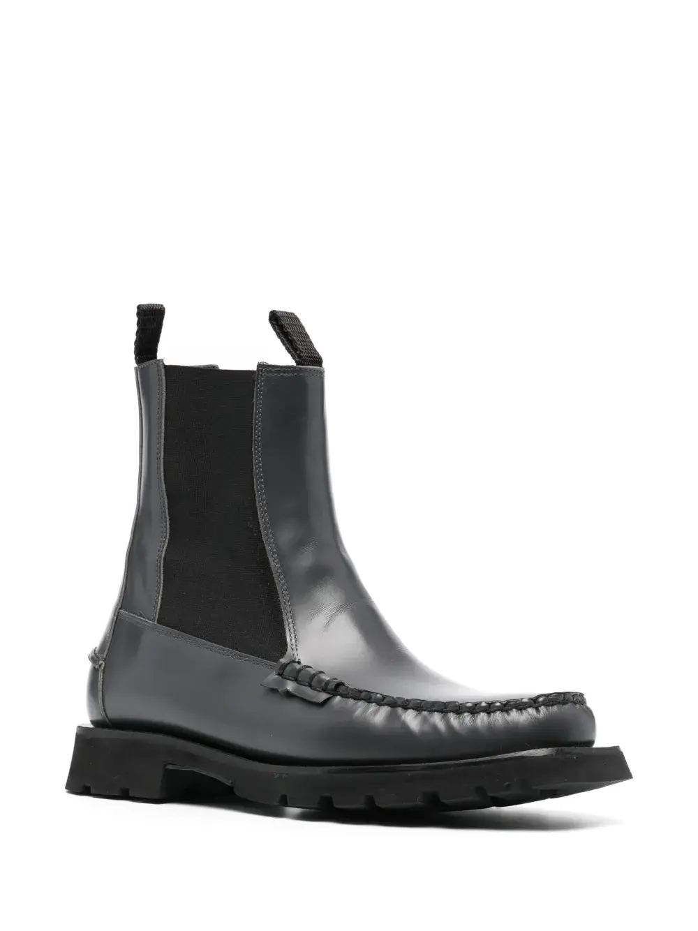 Угольно-серый, телячья кожа, обметочный шов, эластичные боковые вставки, петля для подтягивания сзади, закругленный носок, высота по щиколотку, стелька с логотипом и низкий блочный каблук.