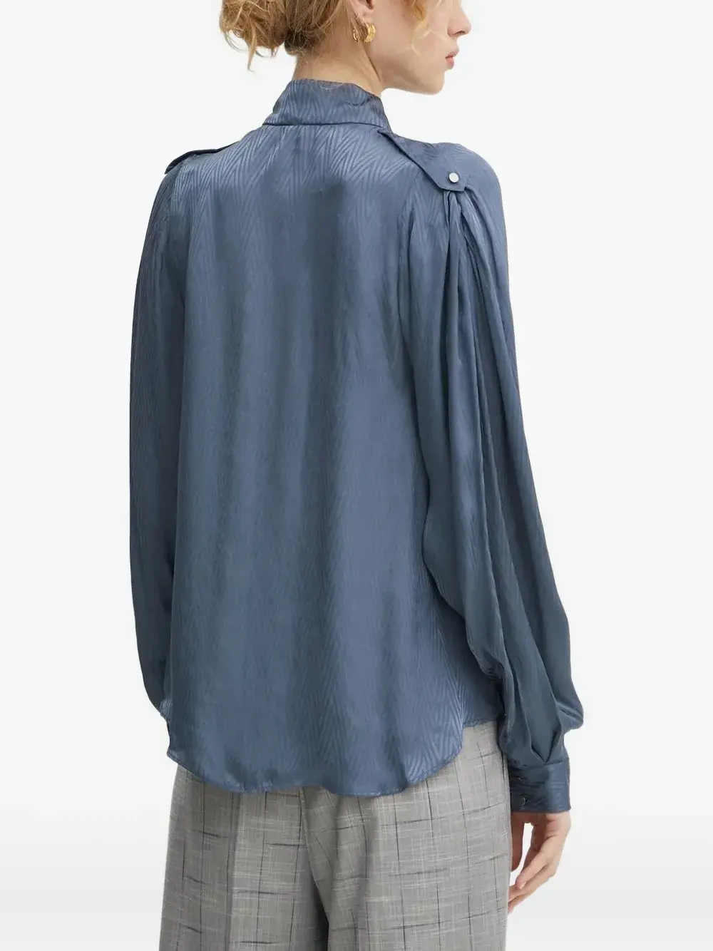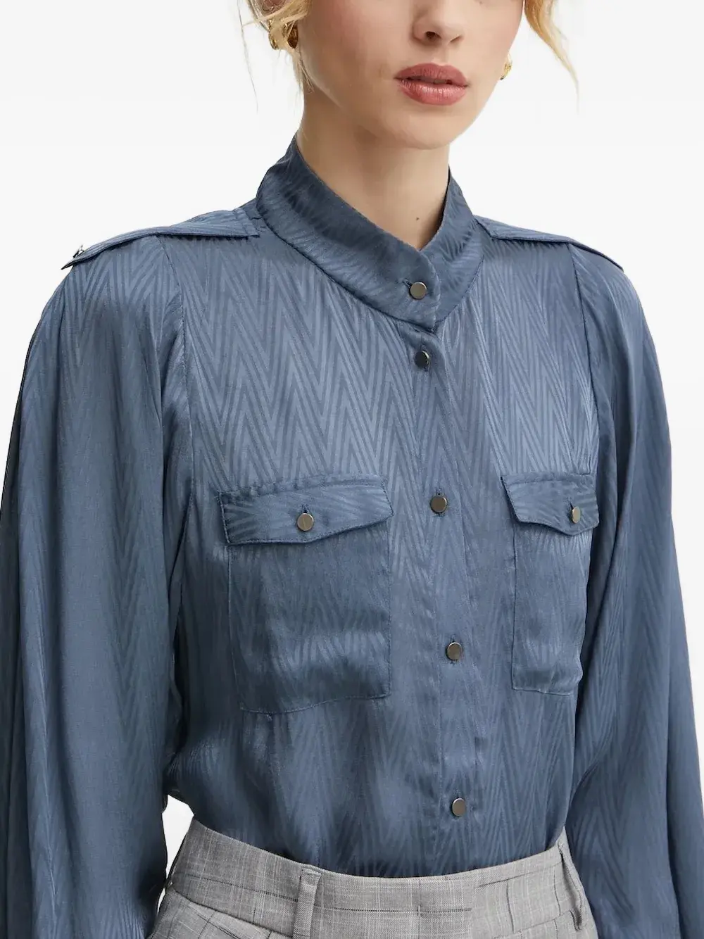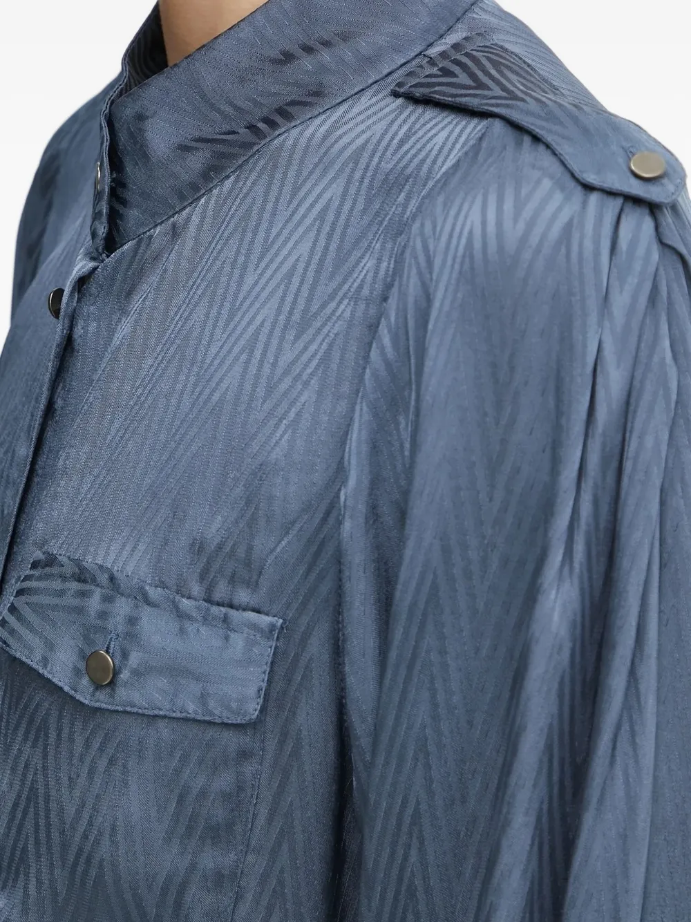 Узор «ёлочка» цвета индиго, воротник-стойка с длинными рукавами, застёжка на пуговицы спереди, нагрудные карманы с клапанами