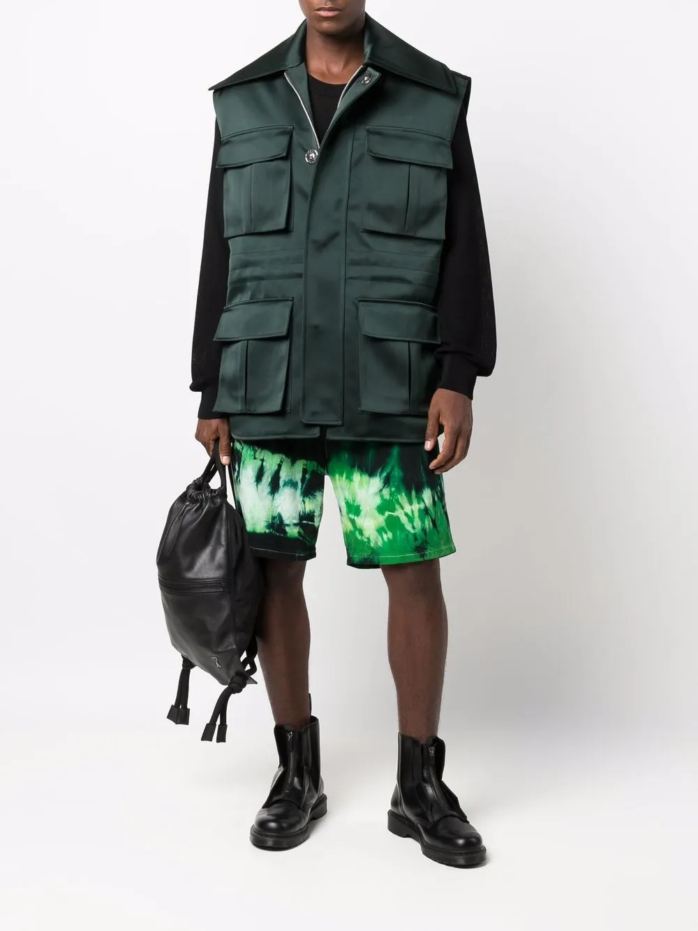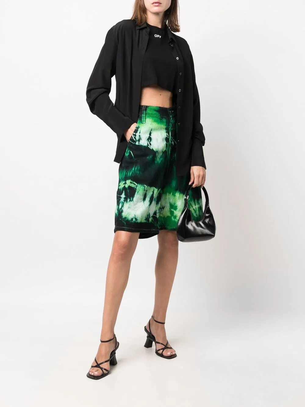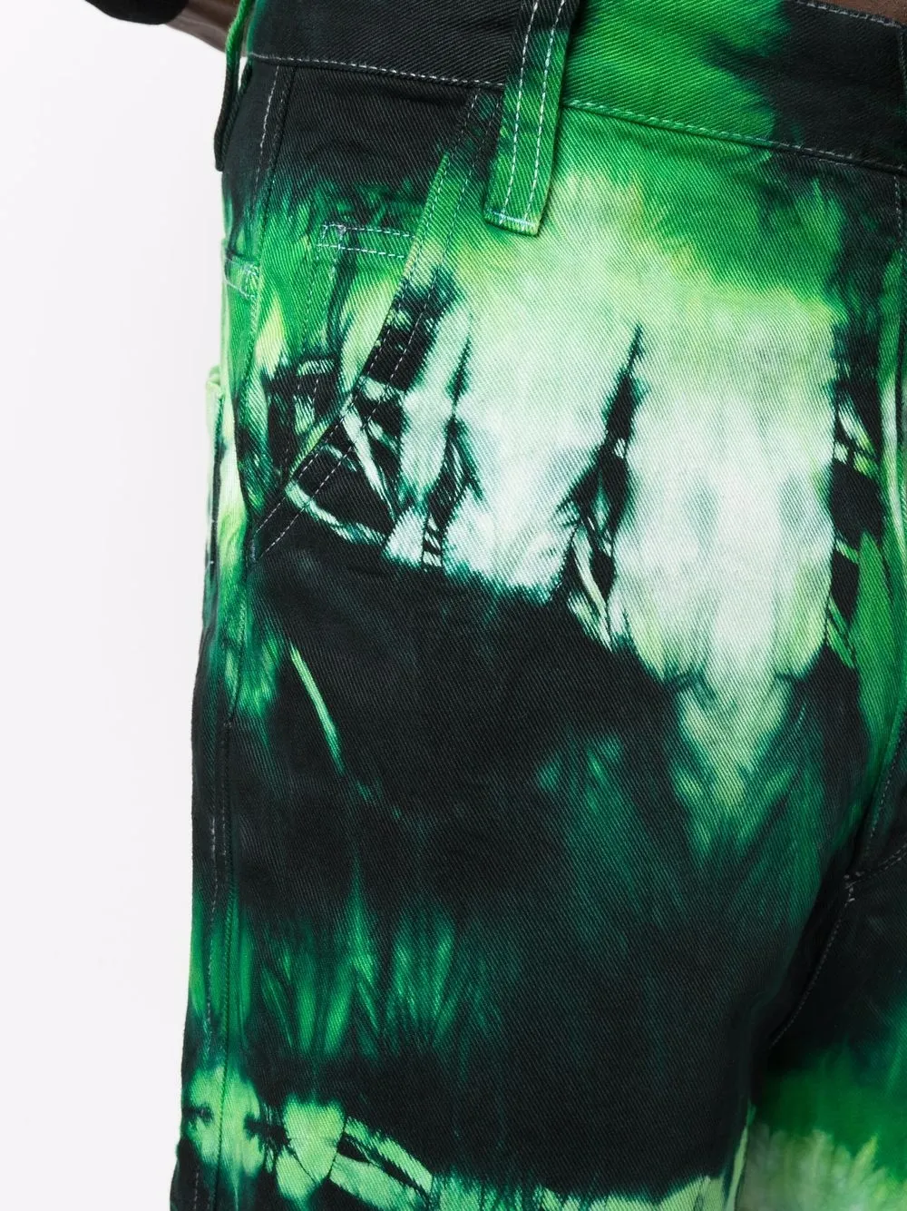 Принт тай-дай, нашивка с логотипом сзади, завышенная талия, свободный крой, петли для ремня, застежка на молнии и пуговице спереди, классическая пятикарманная модель и длина по колено. Цвет: зеленый. Это унисекс-модель. Обратите внимание, что для нее используется мужская размерная сетка.
