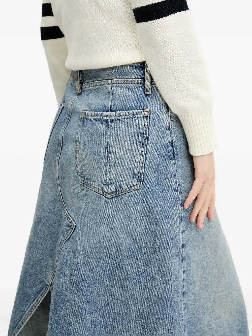 Светло-голубой стираный деним, А-силуэт, разрез сзади, пять карманов, застежка на пуговицы