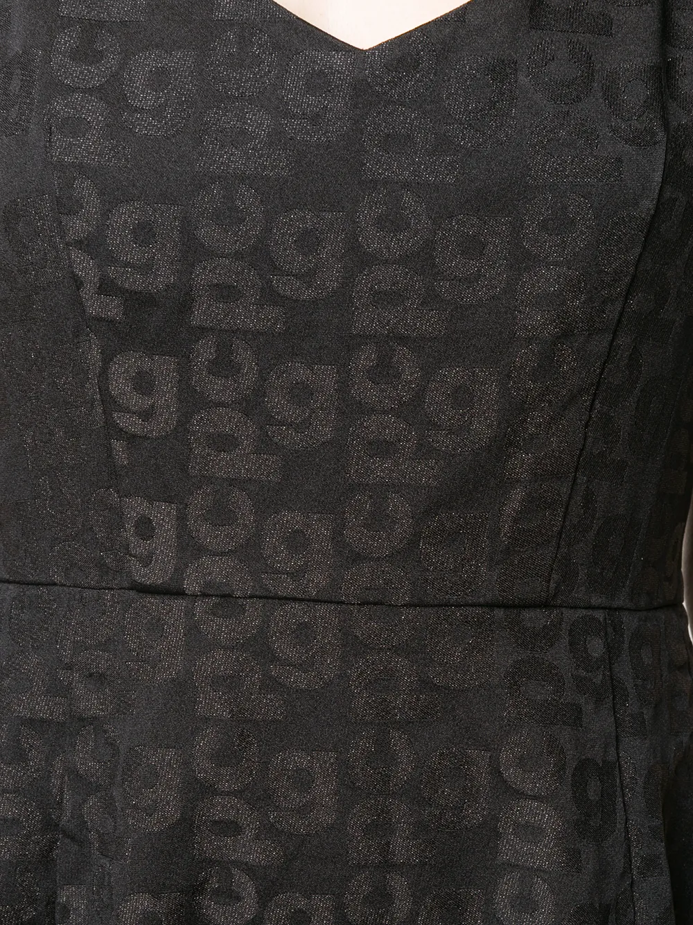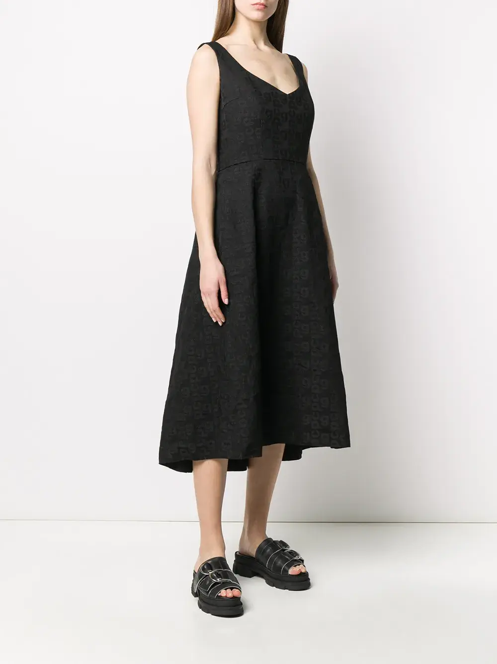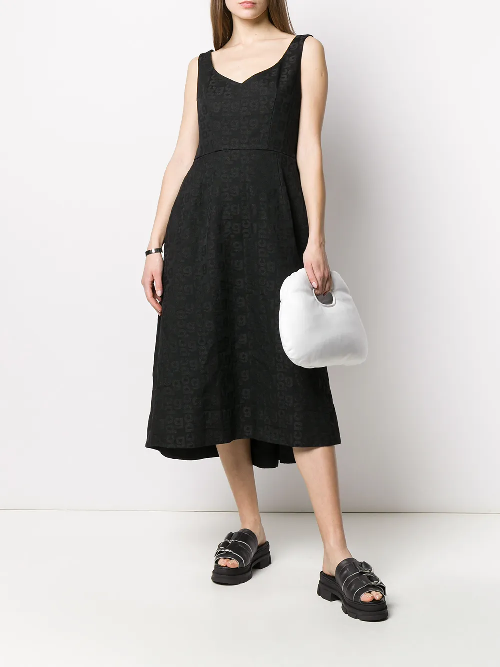 Платье миди А-силуэта с монограммой от Comme Des Garçons. Узор с монограммами, А-образный силуэт, V-образная горловина, модель без рукавов и застежка на молнии сзади. Цвет: черный.