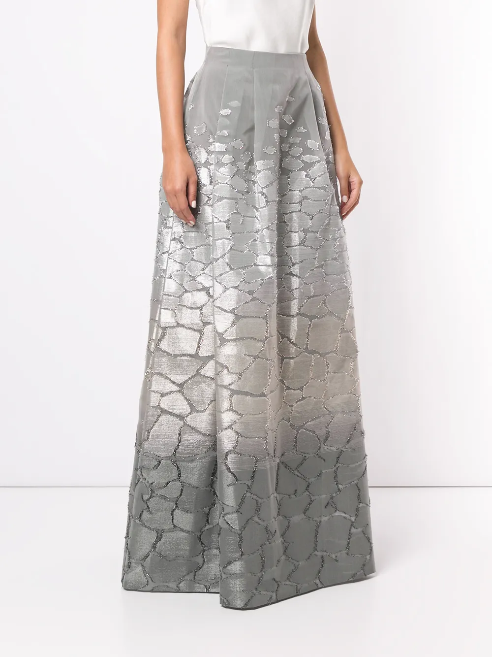 Юбка А-силуэта с эффектом металлик от Alberta Ferretti. Завышенная посадка, удлиненная модель, застежка на молнии сбоку, декоративная строчка и детали с рюшами. Цвет: серый.