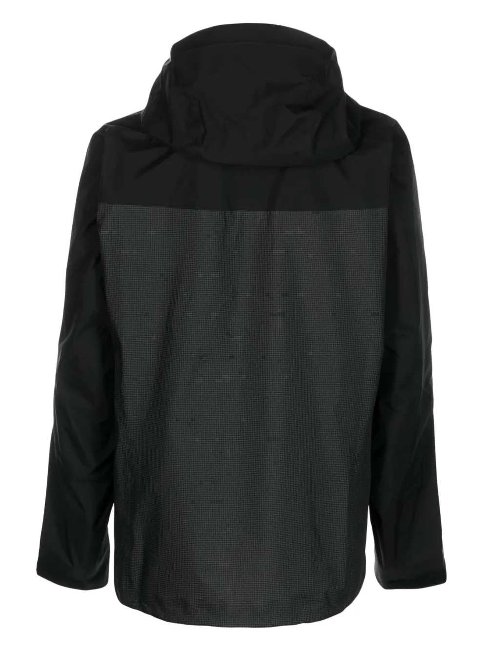 Черный, темно-серый, водонепроницаемый материал GORE-TEX, ветронепроницаемый материал, вставки, вышитый логотип на груди, клетчатый узор, затягивающийся на шнурок капюшон, воротник-труба, застежка на молнии спереди, два кармана на молнии по бокам, длинные рукава, манжеты на липучках и закругленный подол сзади.