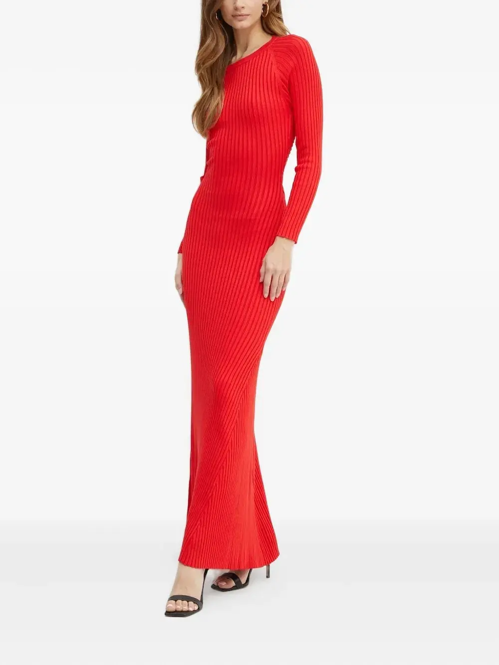 Красный трикотаж в рубчик, длинные рукава, открытая спина, скрученная деталь