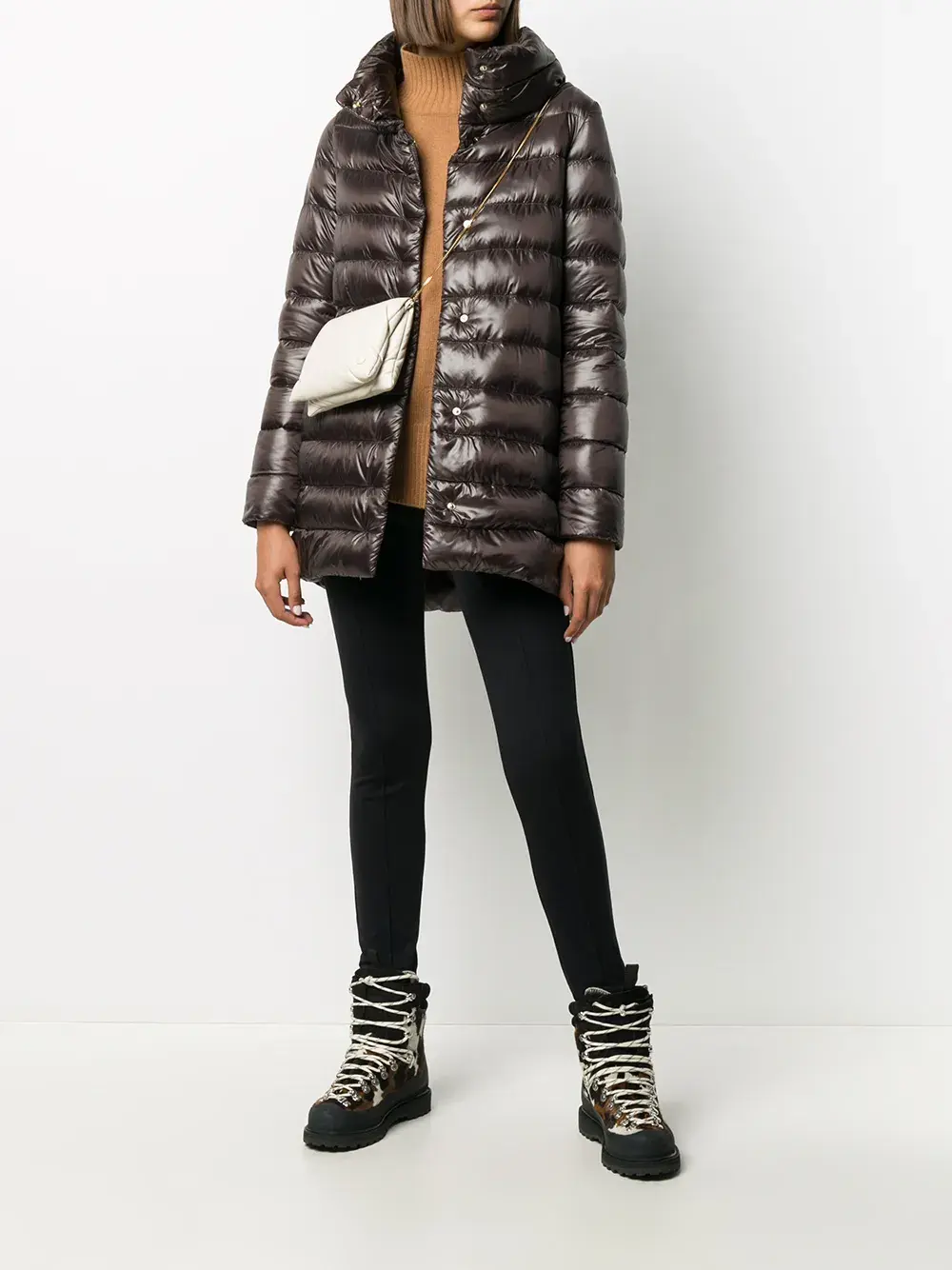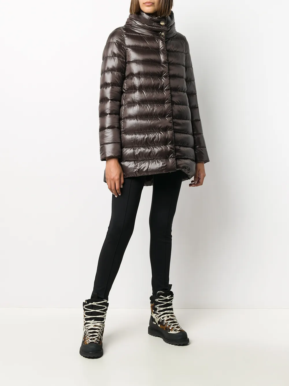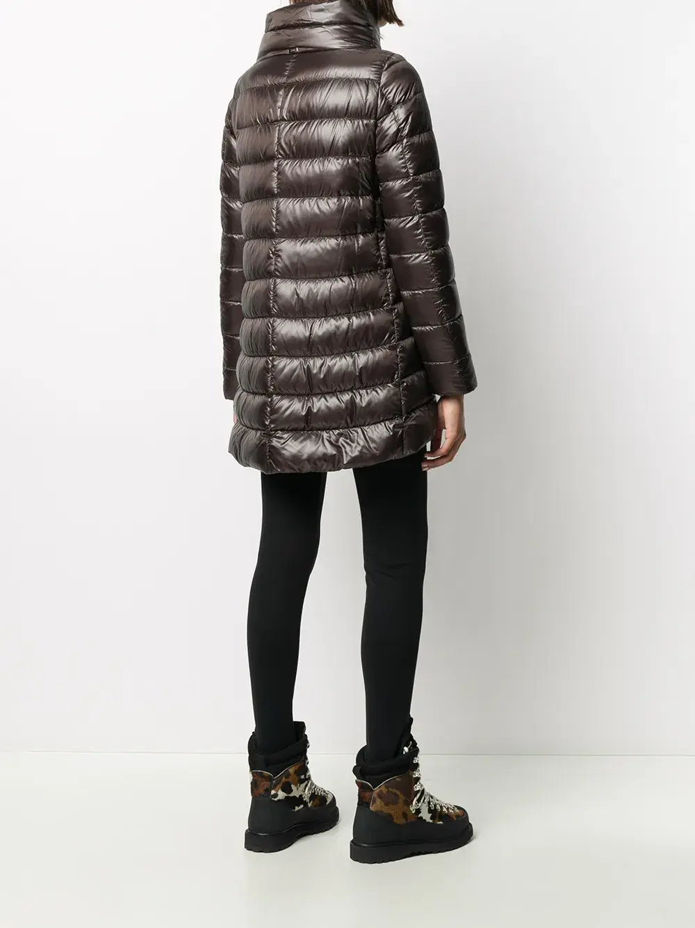 Cтеганая модель, застежка на пуговицах спереди, высокий воротник и А-образный силуэт. Цвет: коричневый.