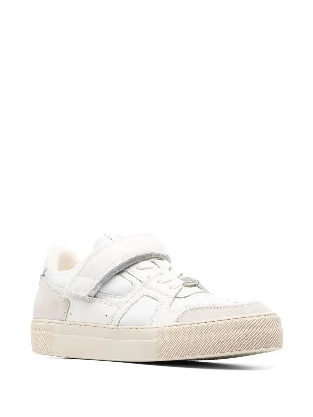 Белый, телячья кожа, вставки, закругленный носок, перфорированный носок, нашивка с логотипом на язычке, шнуровка спереди, задник с логотипом и плоская резиновая подошва.