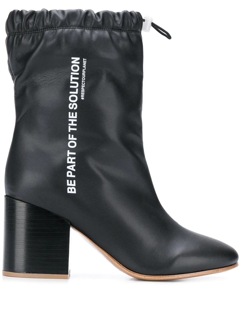 Ботильоны со шнурком от F_WD. Миндалевидный носок, наборный каблук средней высоты, декоративный слоган и модель слип-он, без застежки.