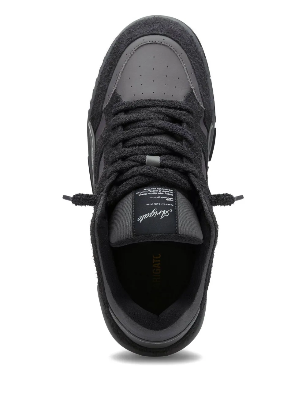 Верх из черной кожи и замши, фактурная шнуровка, логотип, массивная резиновая подошва, низкий дизайн