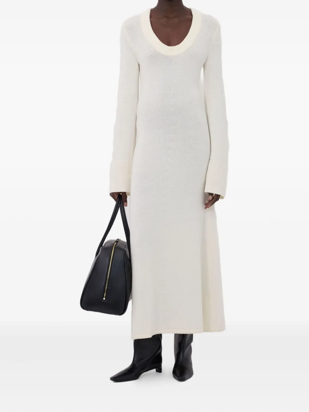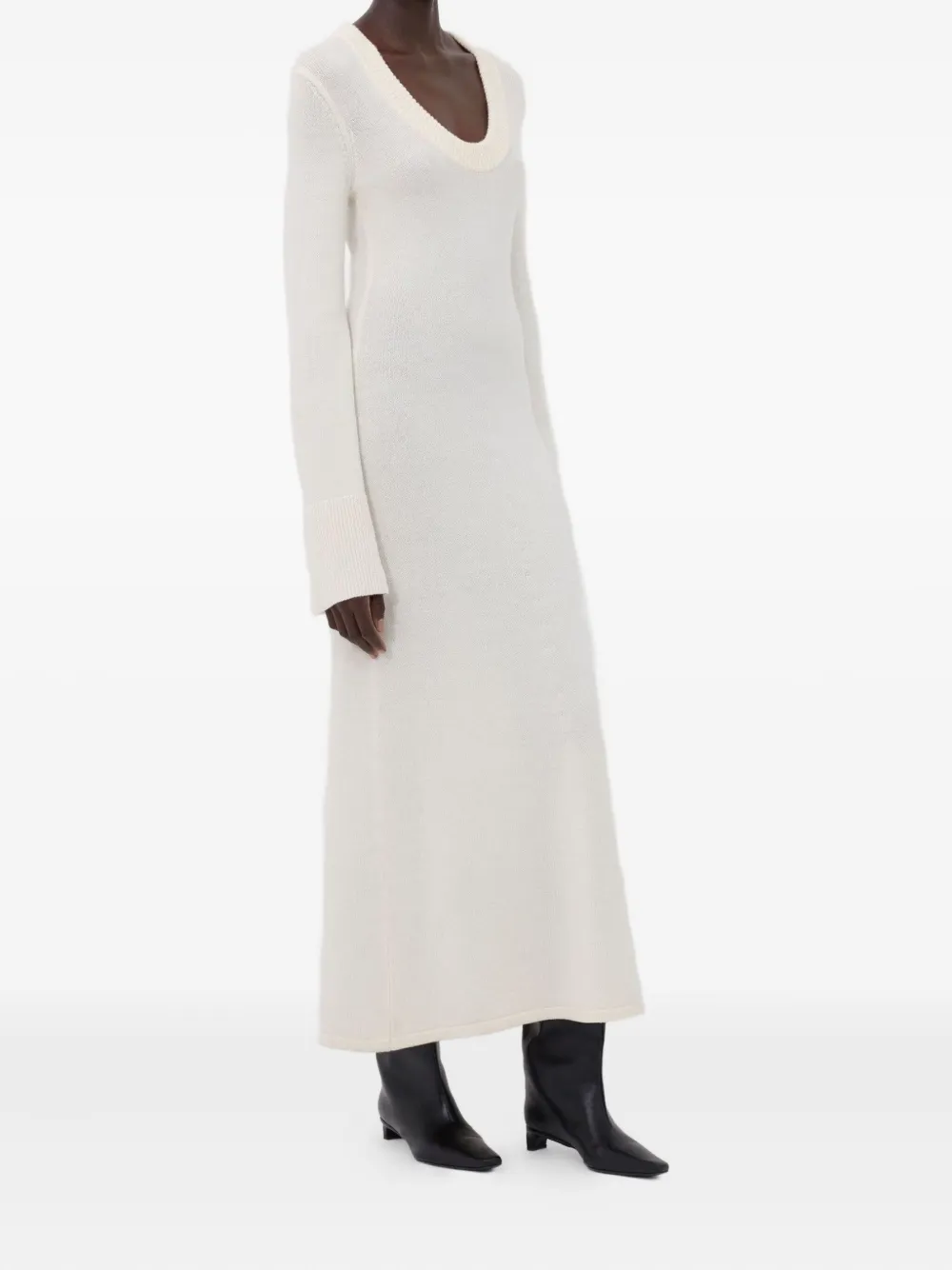 Белоснежная шерстяно-кашемировая смесь, круглый вырез, длинные рукава, приталенная юбка А-силуэта