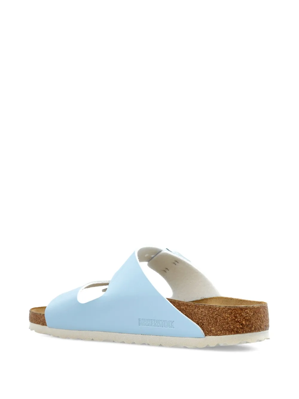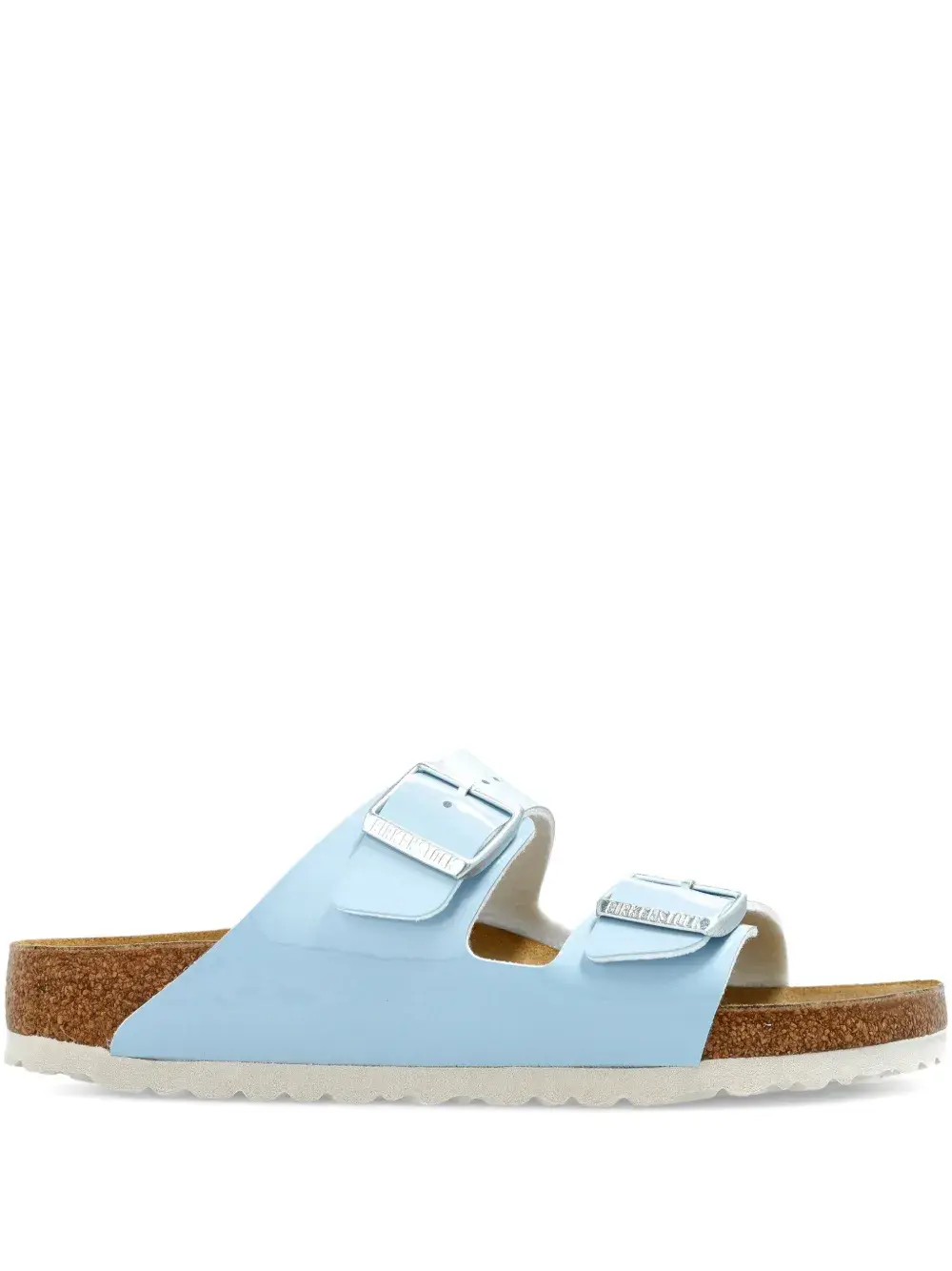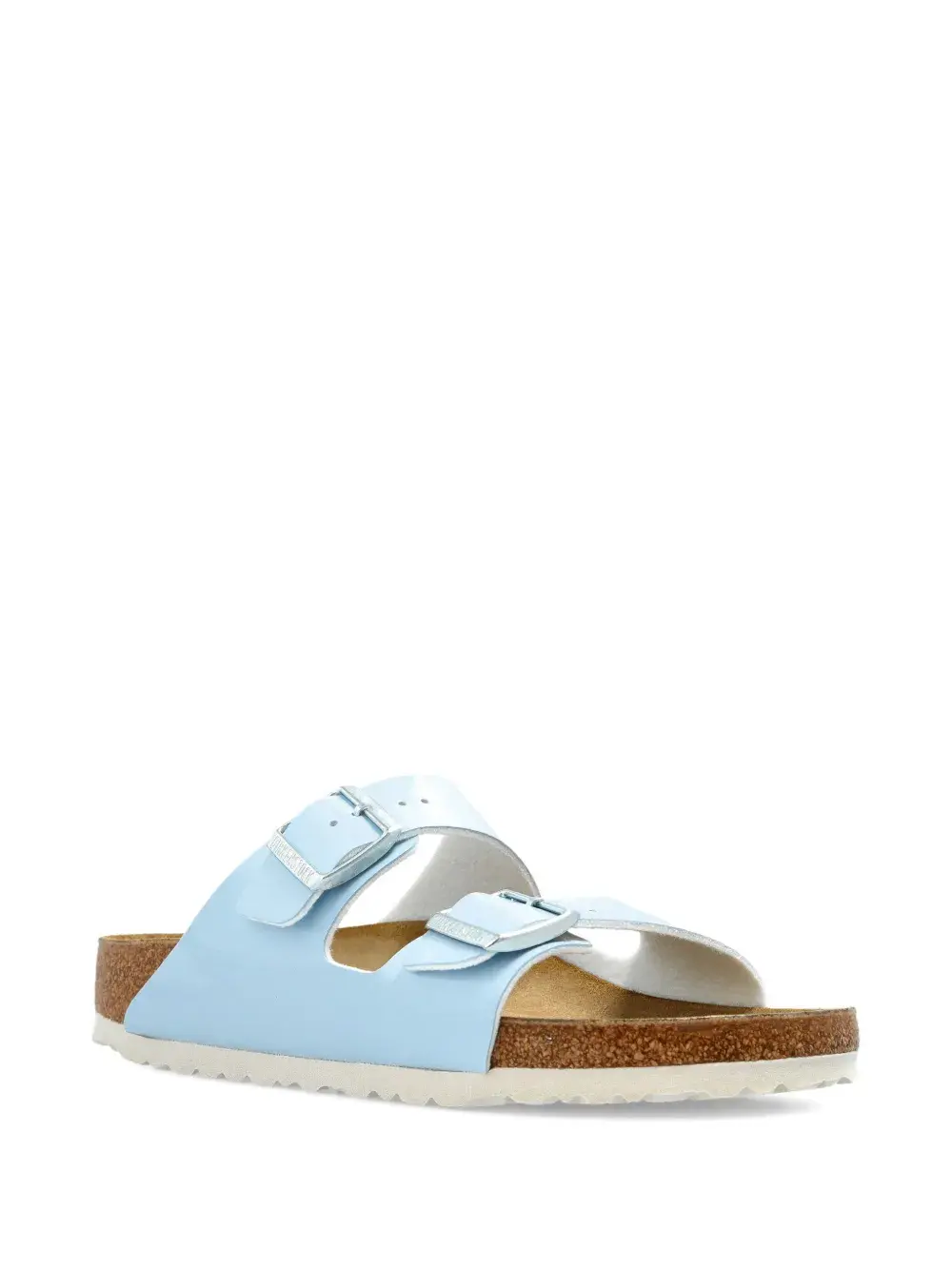 Синяя лакированная кожа, двойные ремешки с пряжками, пробковая стелька, замшевая стелька, резиновая подошва.