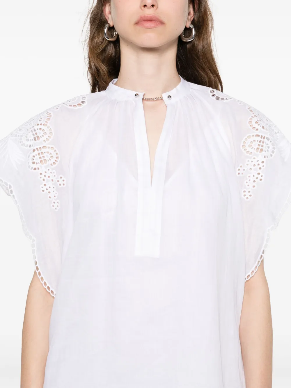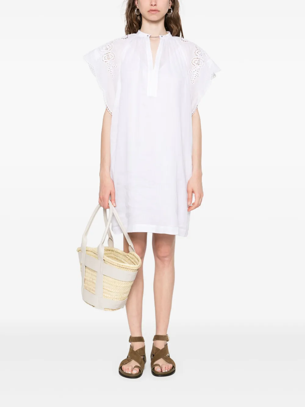 Белая передняя часть с каплевидной застежкой, вышитая англез, рукава-крылышки длиной до бедра