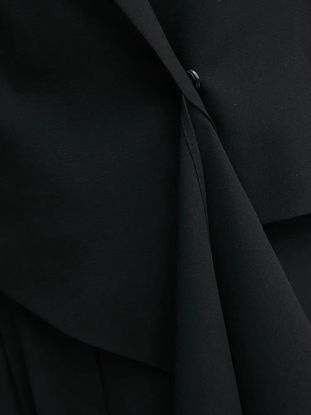 Черная асимметричная драпировка, зазубренные лацканы, длинные рукава, асимметричный подол.