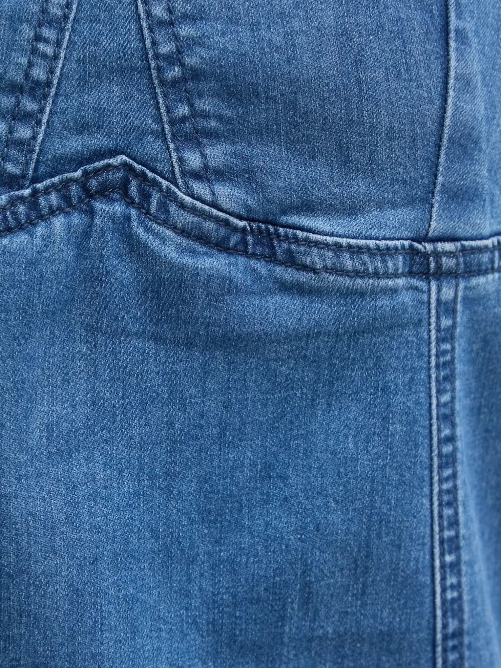 Джинсовый синий, асимметричный подол с оборками, тонкие бретельки, декоративный шов, прямой вырез.