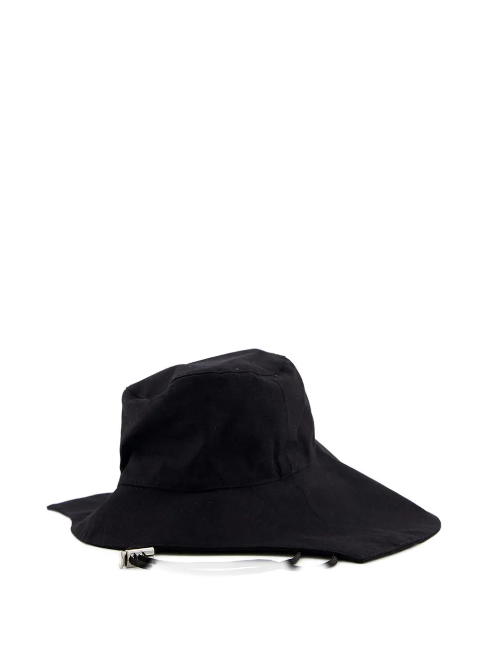 Черная асимметричная шляпа с регулируемым краем, плоская тулья, широкие поля, затягивающиеся на шнурок.