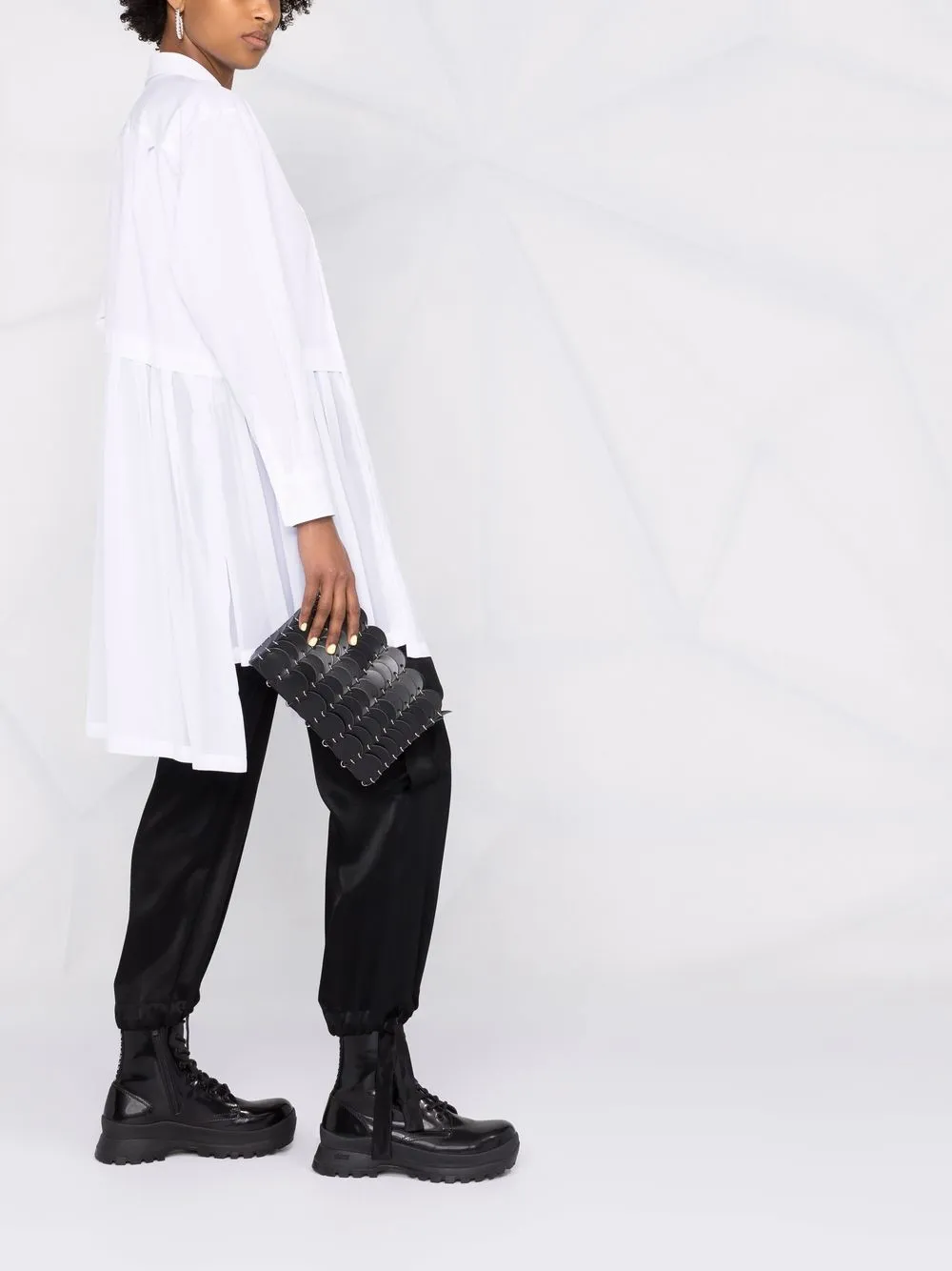 Прямой воротник, смещенная застежка на пуговицах спереди, длинные рукава, асимметричный подол и плиссировка. Цвет: белый.