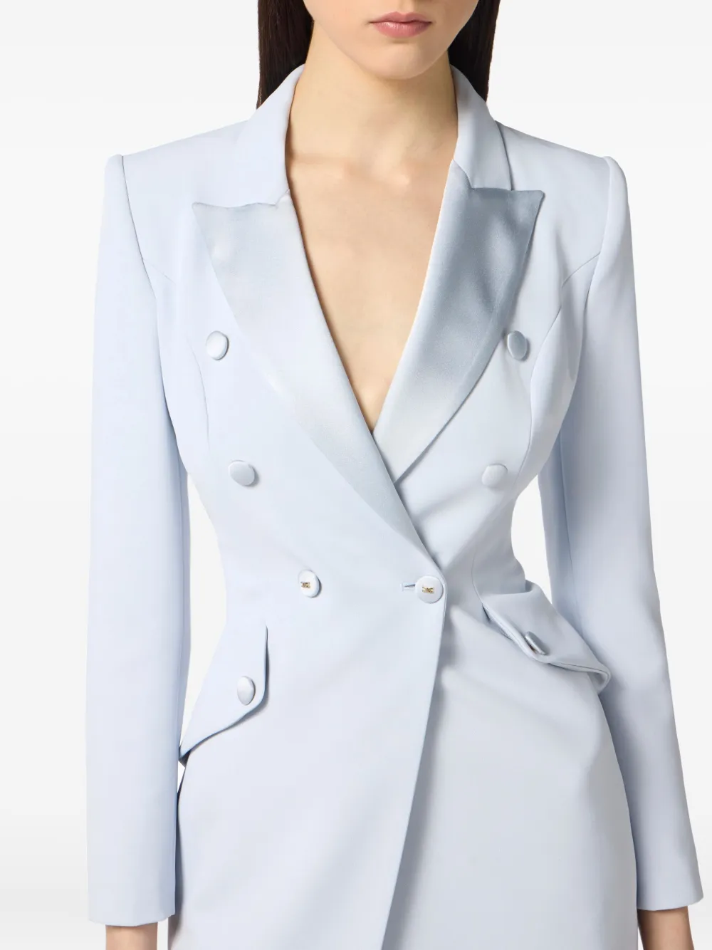 Светло-голубой двубортный пиджак с асимметричным подолом, фирменными пуговицами.