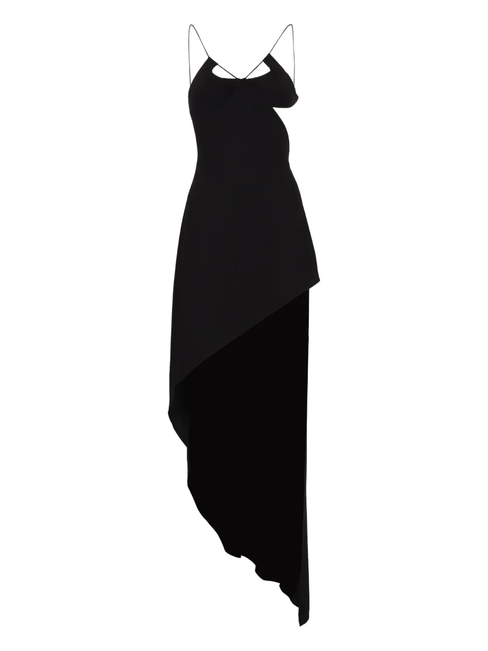 Черные тонкие бретельки, присборенные детали, асимметричный подол, драпировка