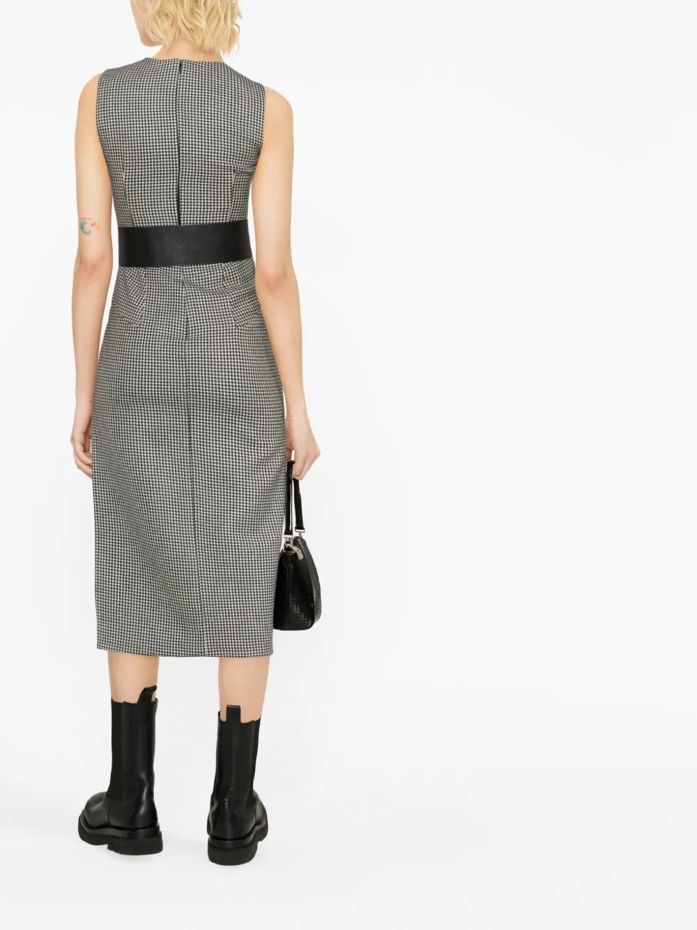 Черный, цвет слоновой кости, шерсть, узор в ломаную клетку, круглый вырез, без рукавов, ремень на талии, боковой разрез, длина до середины икры и потайная застежка на молнии сзади.