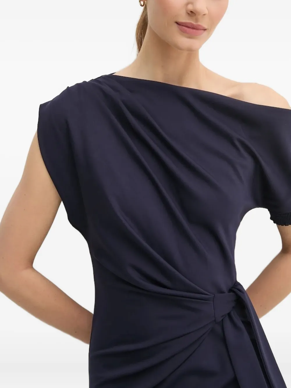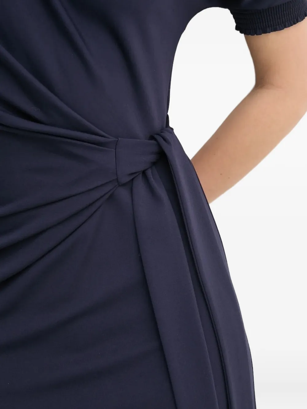 Темно-синий пояс с завязками, короткие рукава, асимметричный вырез.