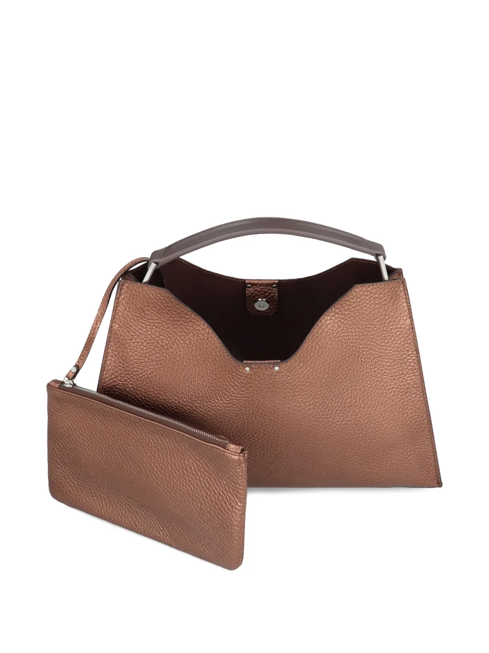 Коричневый текстурированный кожаный кошелек с ручкой, внутренним карманом и металлическими деталями.