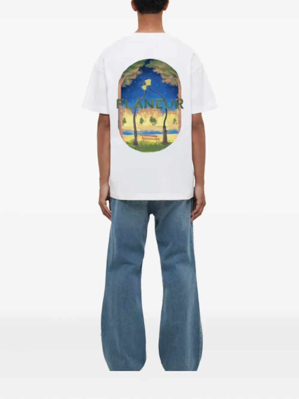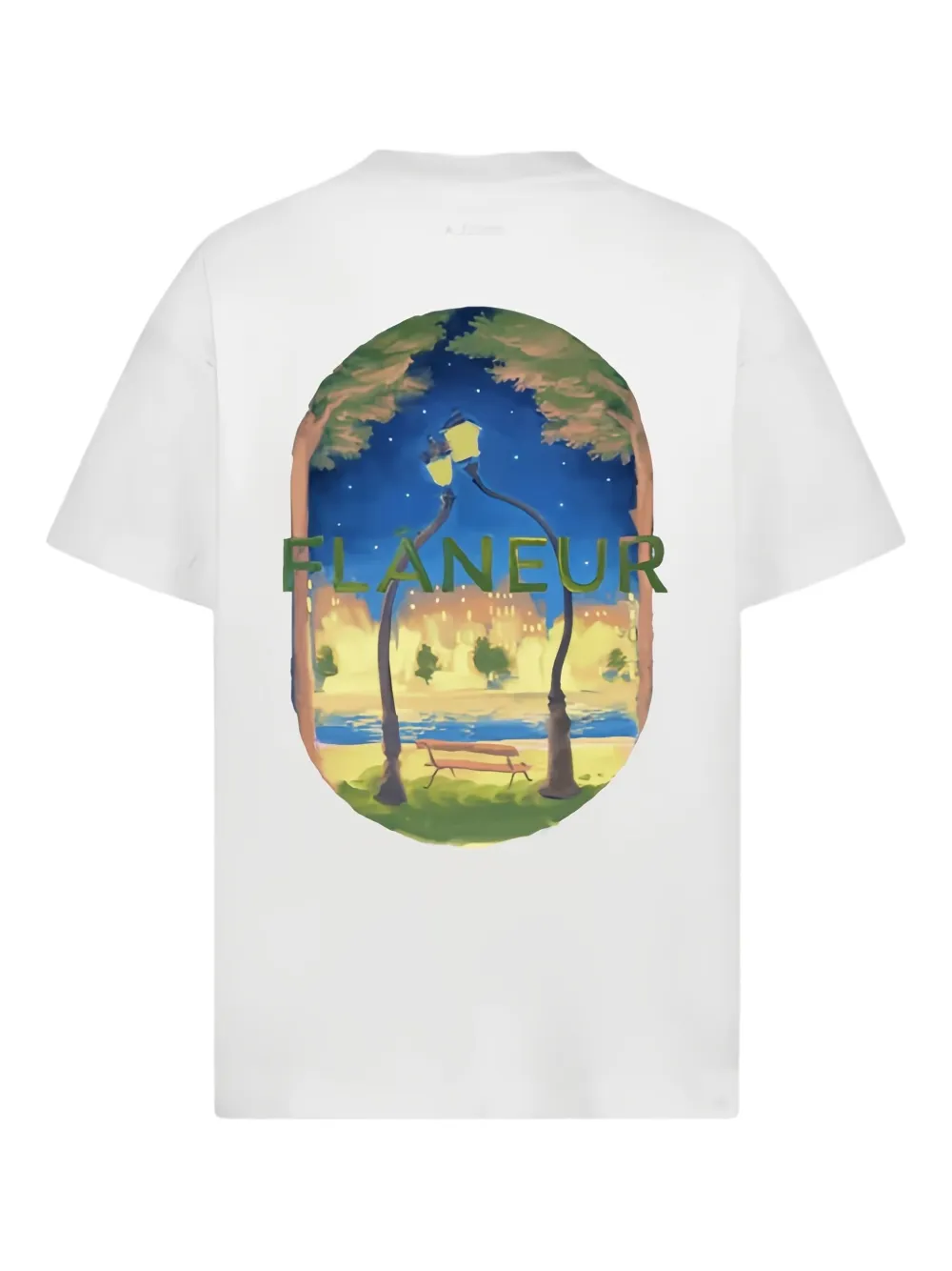 Белая футболка с короткими рукавами, графическим принтом, овальной рамкой, логотипом бренда, парковой сценой
