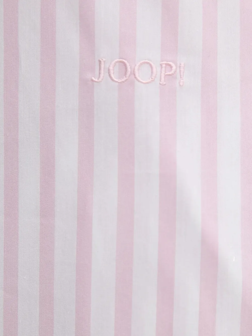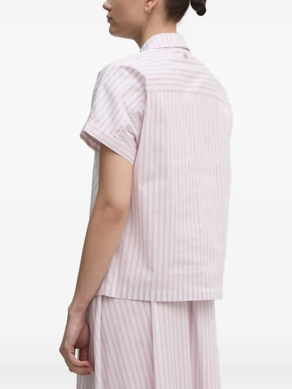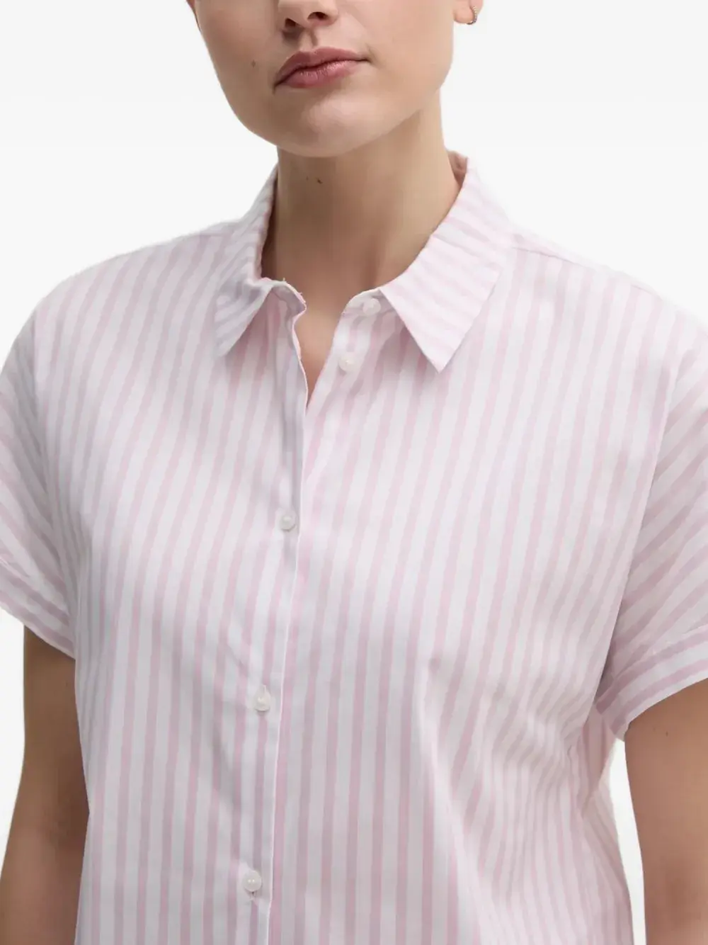 Розовый полосатый рисунок, короткие рукава, застежка на пуговицы спереди, классический воротник, прямой подол.
