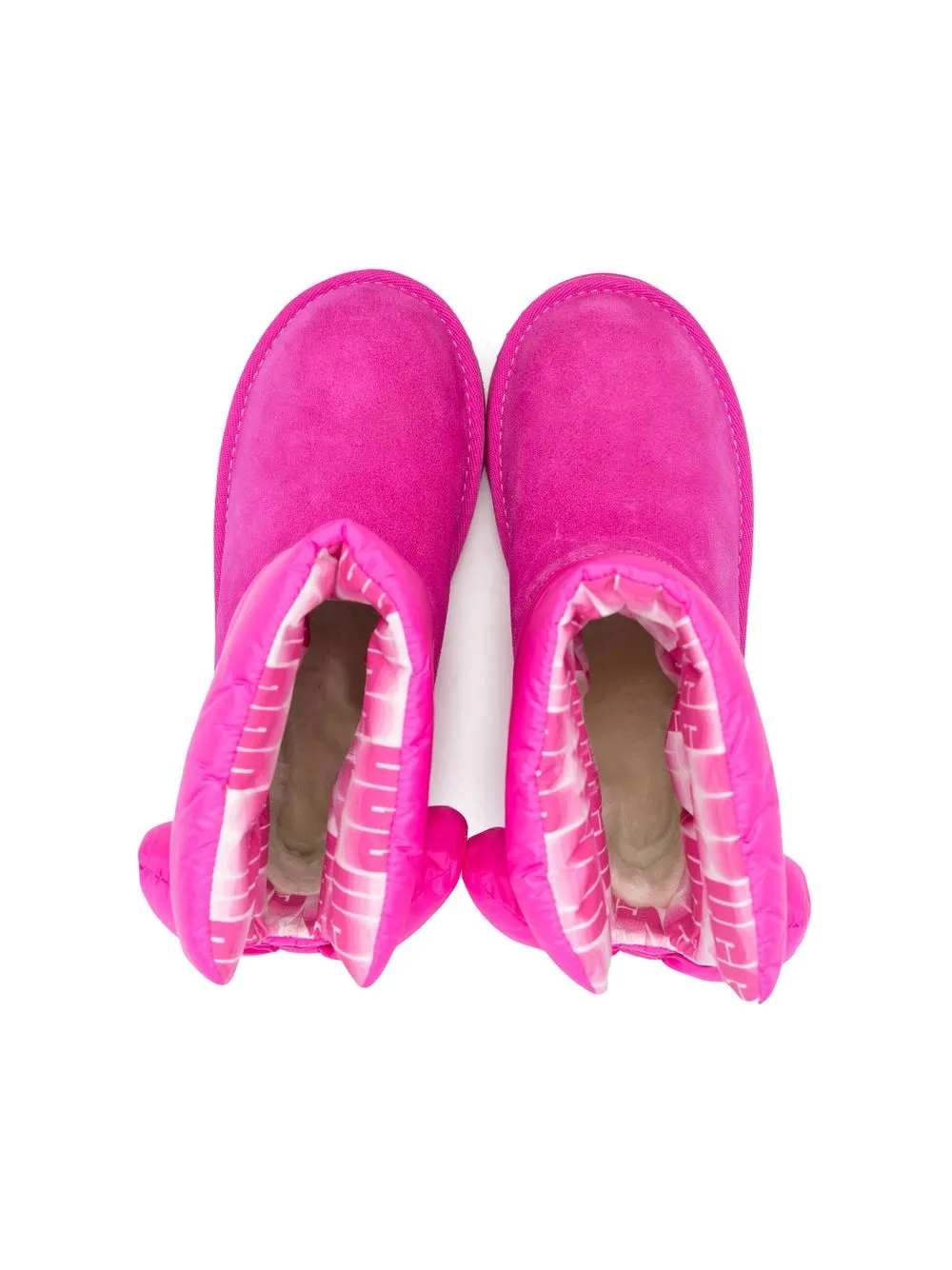 Ярко-розовый, замша из телячьей кожи, уплотненная щиколотка, сочетание двух оттенков, бант, подкладка с логотипами, подкладка из овечьей шерсти, нашивка с логотипом сзади, закругленный носок и модель без застежки.