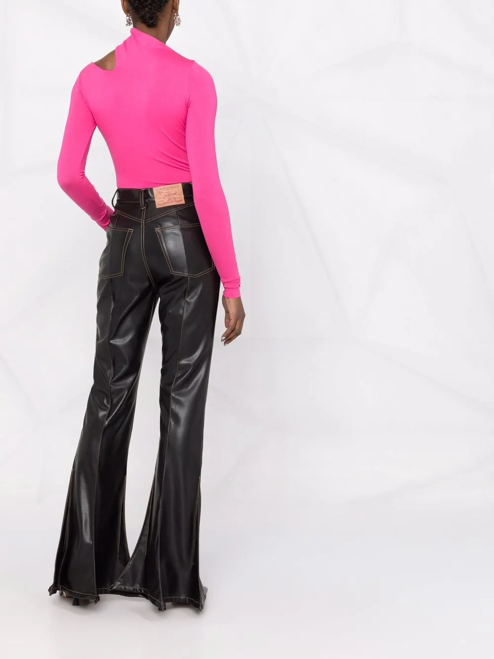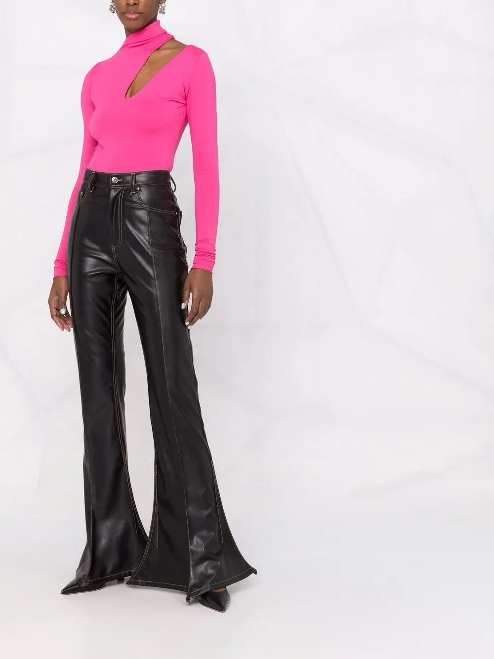 Вырезные детали, высокий воротник, длинные рукава, узкий крой и прямой подол.