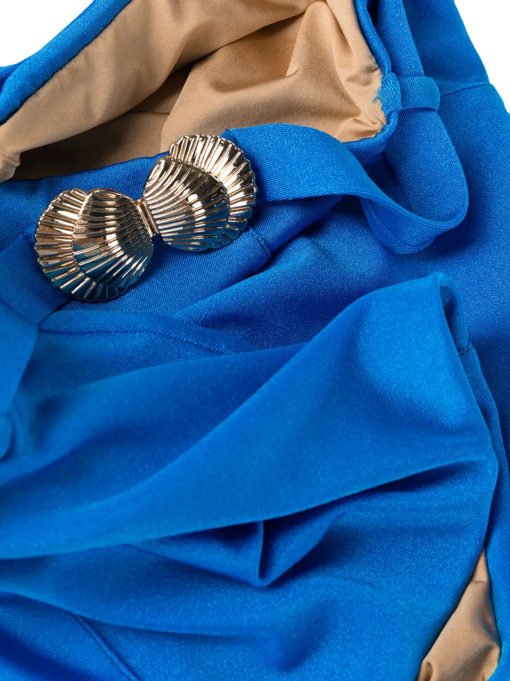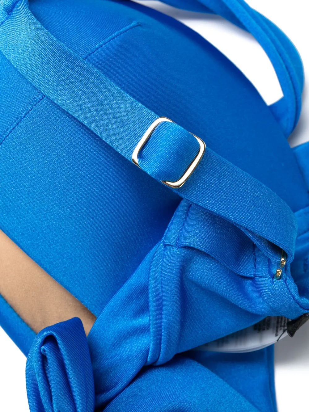 Расцветка Splash Blue, эластичный материал, модель из двух частей, модель бандо, золотистая фурнитура, регулируемые лямки, застежка на завязке сзади, металлический декор, ремень на талии, плавки бикини с завышенной талией и цельная подкладка.