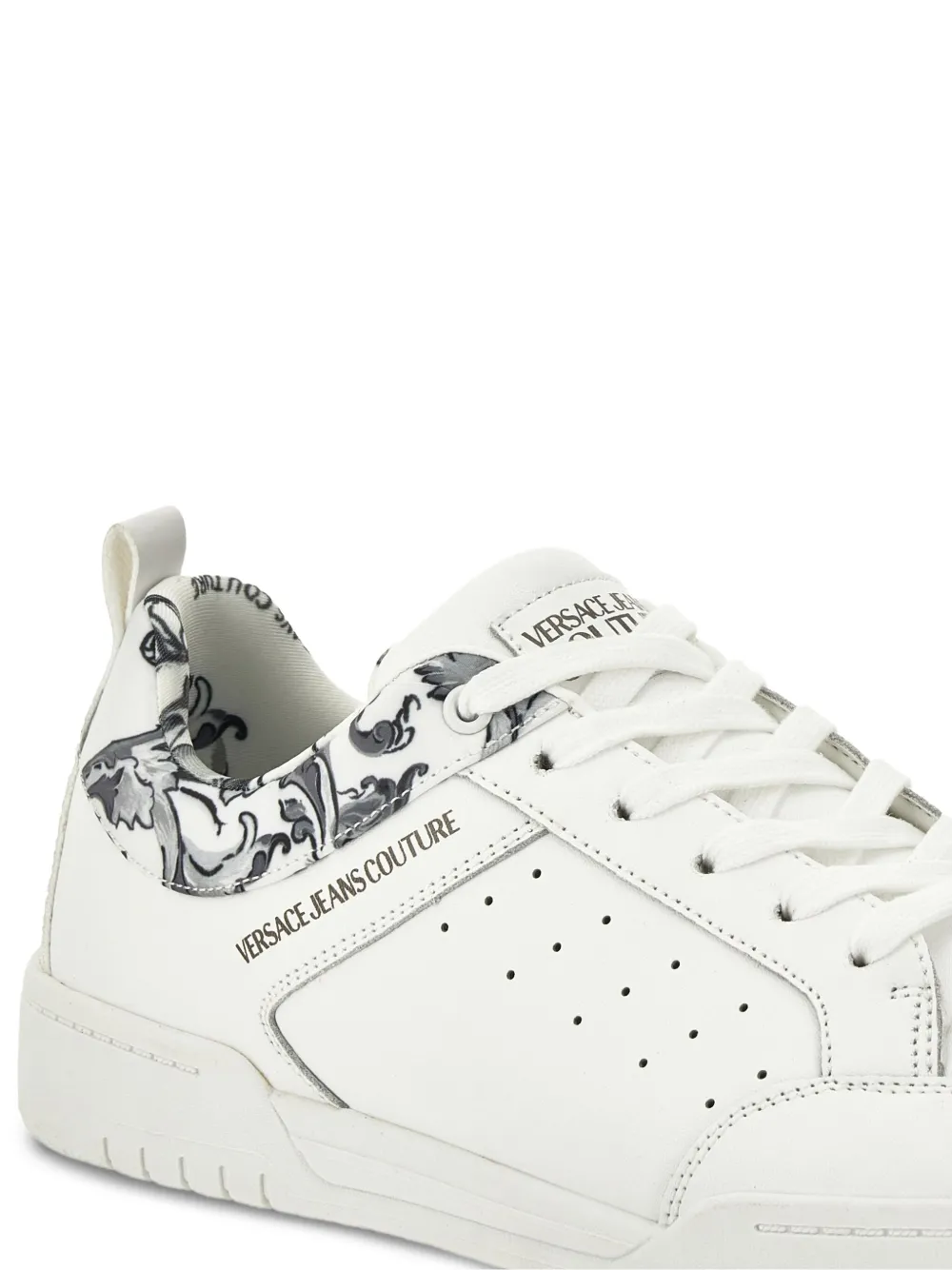 Верх из белой кожи, принт Barocco, пятка с перфорацией, плоская шнуровка, резиновая подошва.