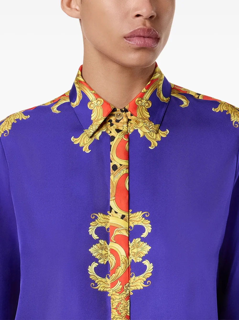Фиолетовый барочный принт, золотая отделка, длинные рукава, застежка на пуговицы.