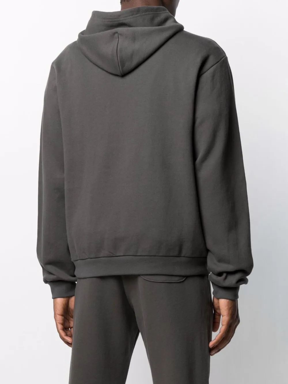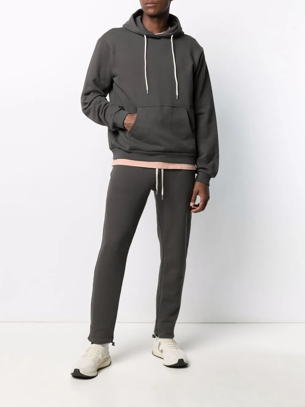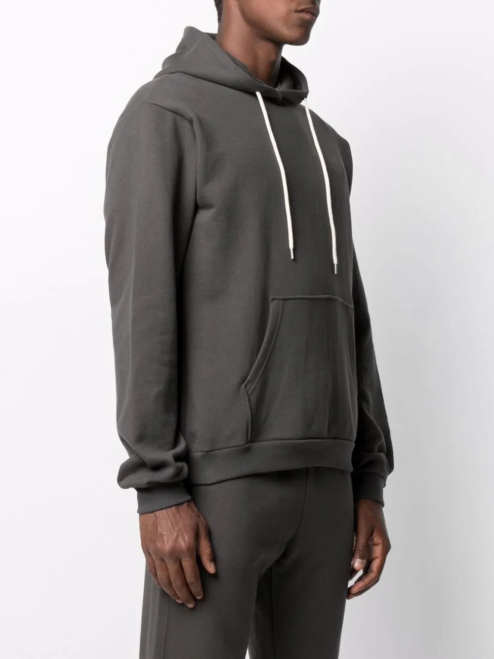 Трикотажный материал, махровый эффект, детали в рубчик, затягивающийся на шнурок капюшон, длинные рукава и карман-муфта.