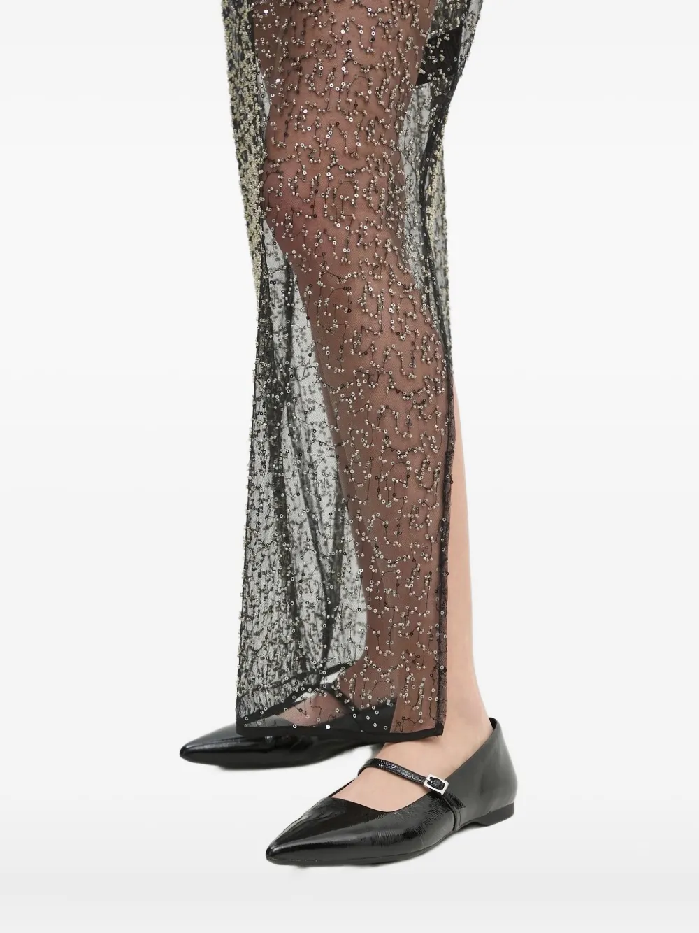 Прозрачный подол длиной до пола, отделанный черным бисером