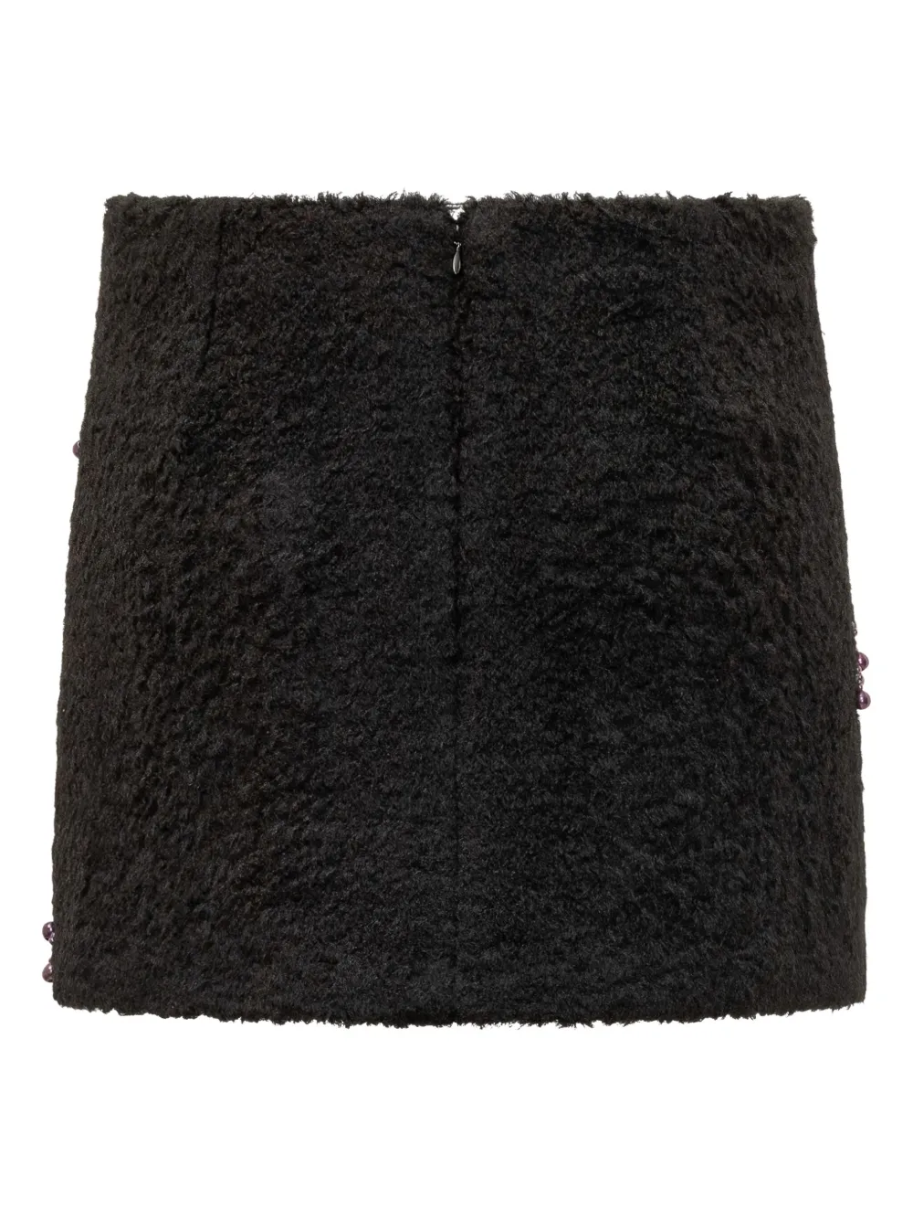 Черная букле-текстура, отделка бисером, потайная застежка-молния сзади.