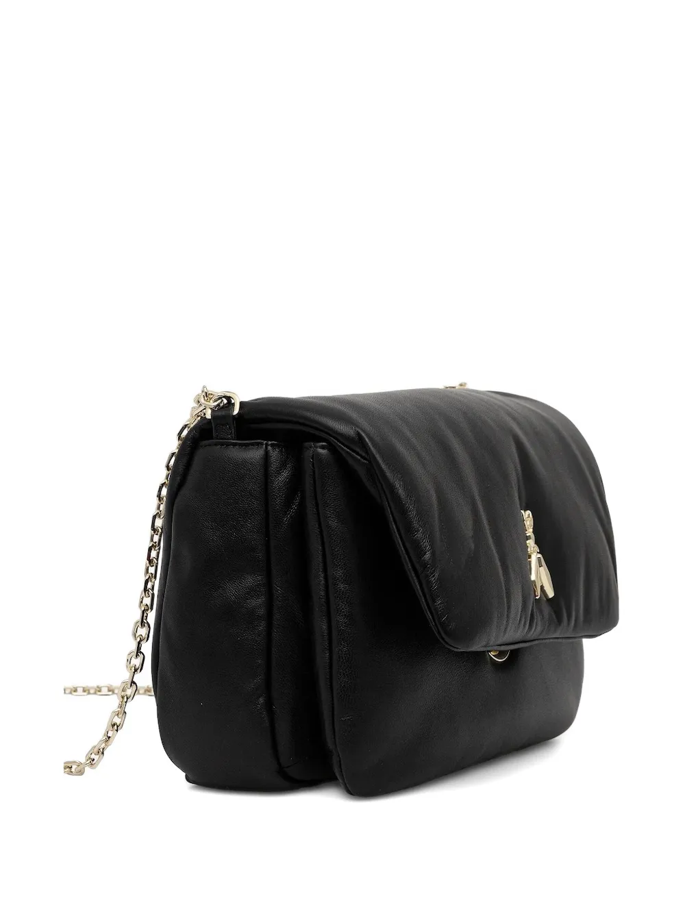 Черная стеганая текстура с пчелой, застежка на клапан с цепочкой и золотистой фурнитурой.