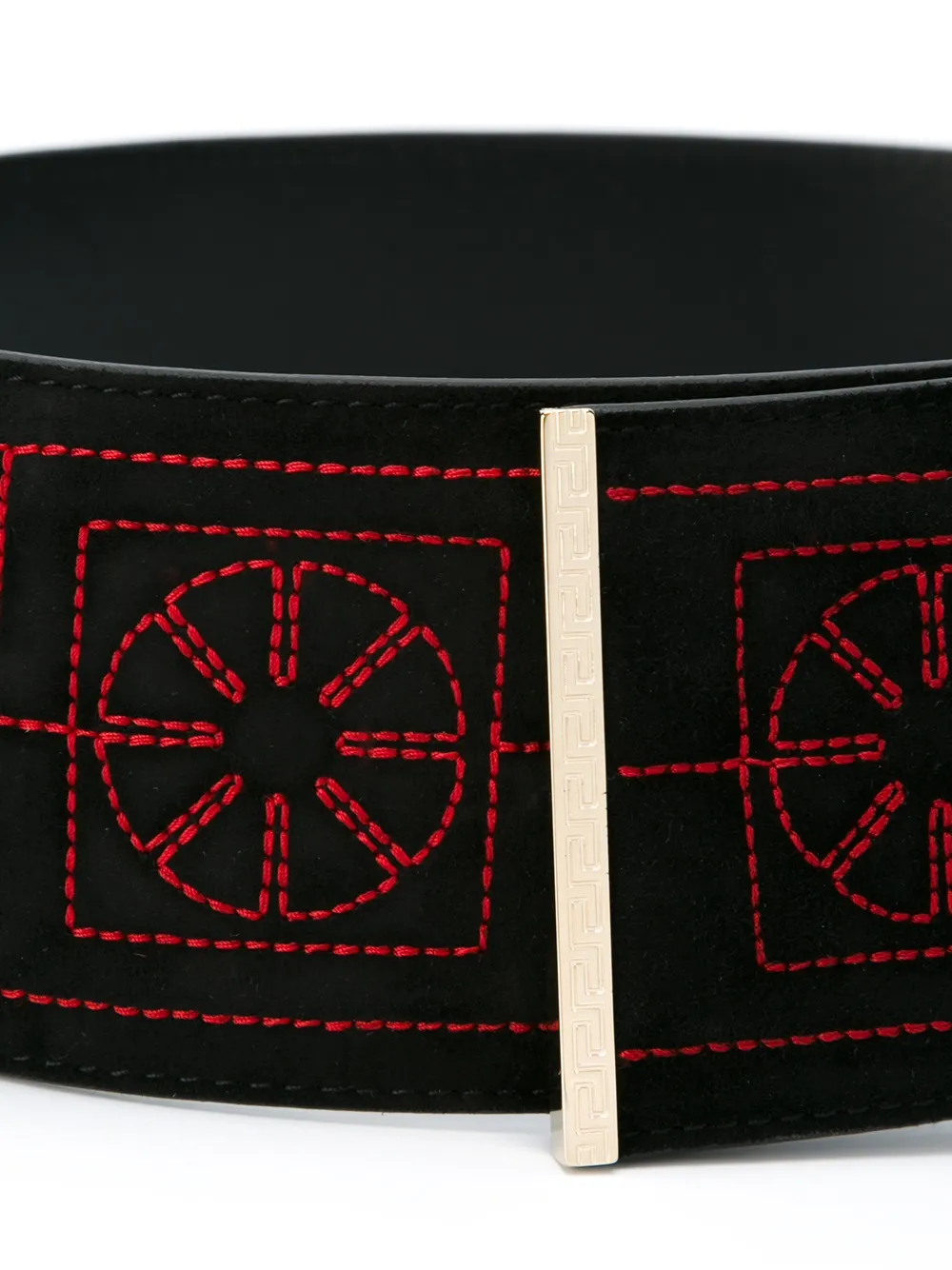 Черный с красным замшевый ремень '#Greek' от Versace. Золотистые детали, регулируемый размер.