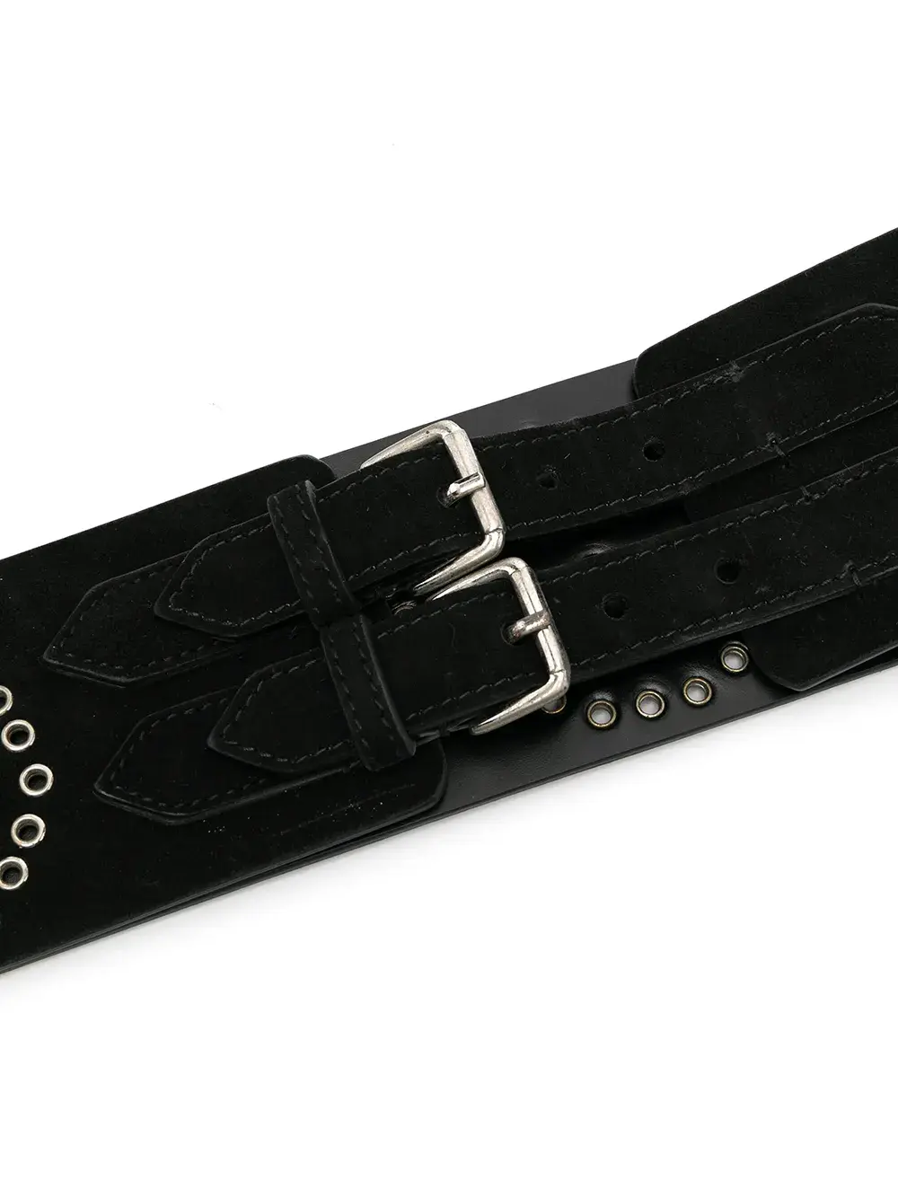 Серебристые заклепки, перфорация и застежка с двумя пряжками.