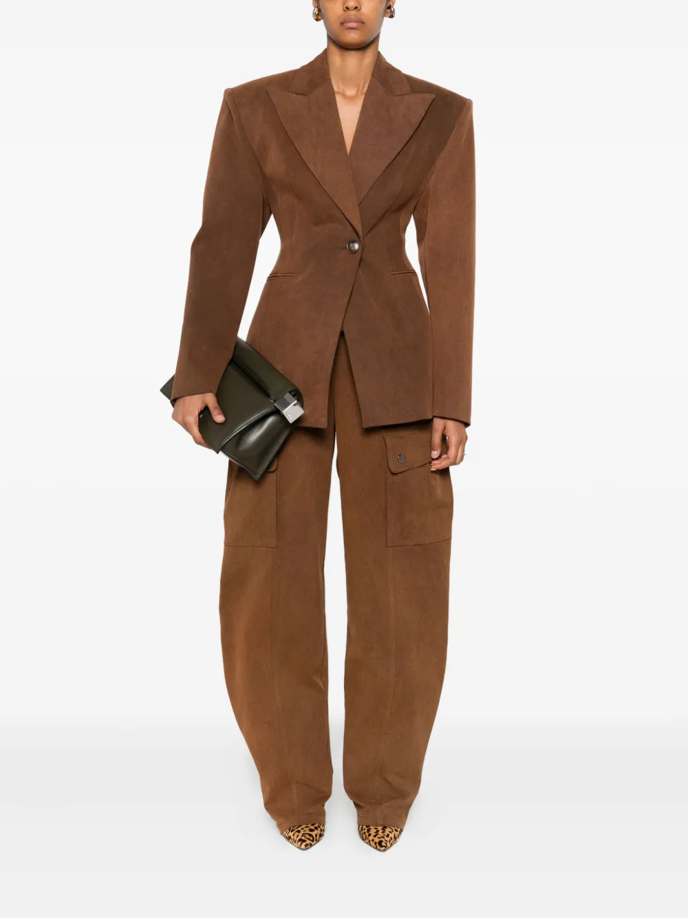 Коричневые накладные карманы, пояс на талии, застежка на кнопку, прямые брюки