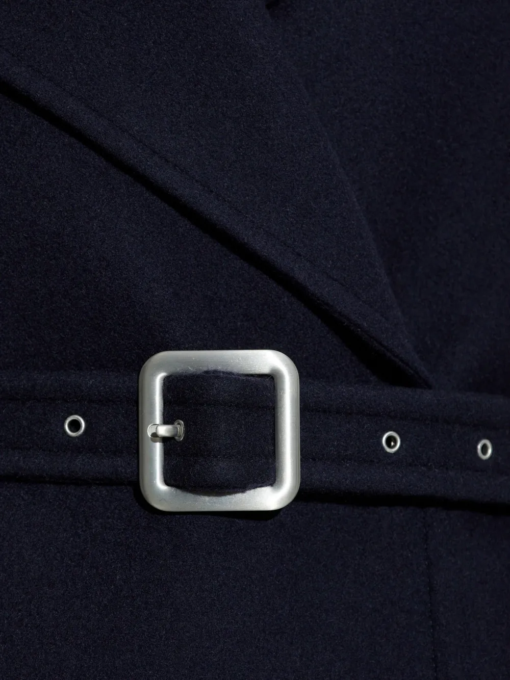 Темно-синий пояс с завязкой, серебристая пряжка, зазубренные лацканы, длинные рукава.